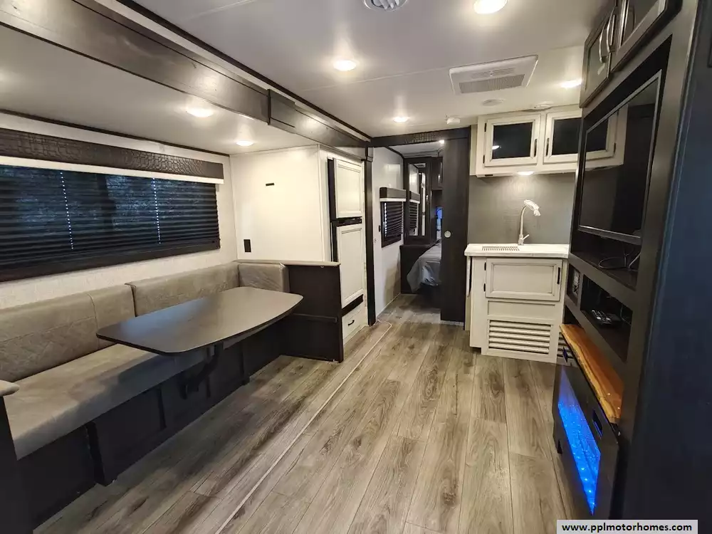 The slide out for the living area houses a large dinette and a 2-door Furrion refrigerator. Across from the slide-out is an entertainment center that features a TV and electric fireplace.
