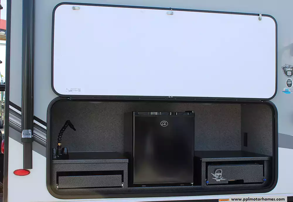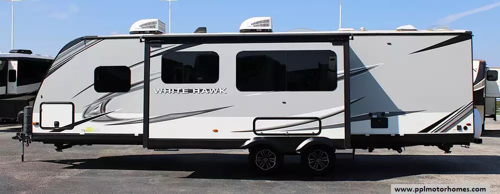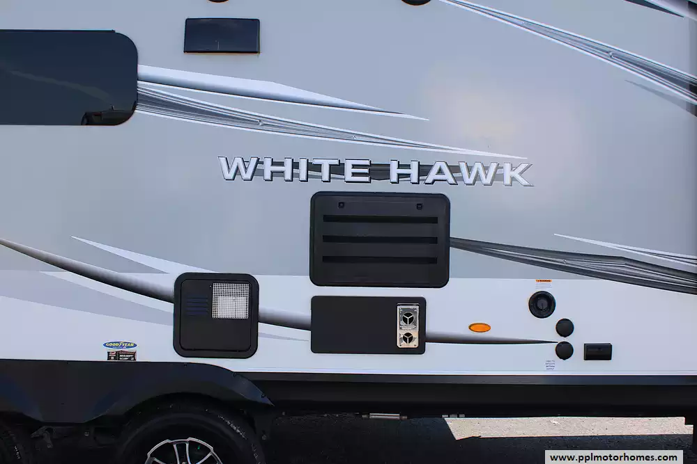 Inside and out, the White Hawk 29BH impresses with features designed for both style and function. Enjoy evenings under the power awning, cook delicious meals in the fully equipped kitchen with modern appliances, or retreat to the spa-like bath after a long day of adventure. With residential touches, a spacious slide-out for extra living room, and multiple entry doors for convenience, this trailer was made to elevate every adventure. For those who want sophistication, comfort, and capability all in one, the White Hawk 29BH is the travel companion you've been waiting for.