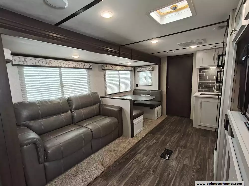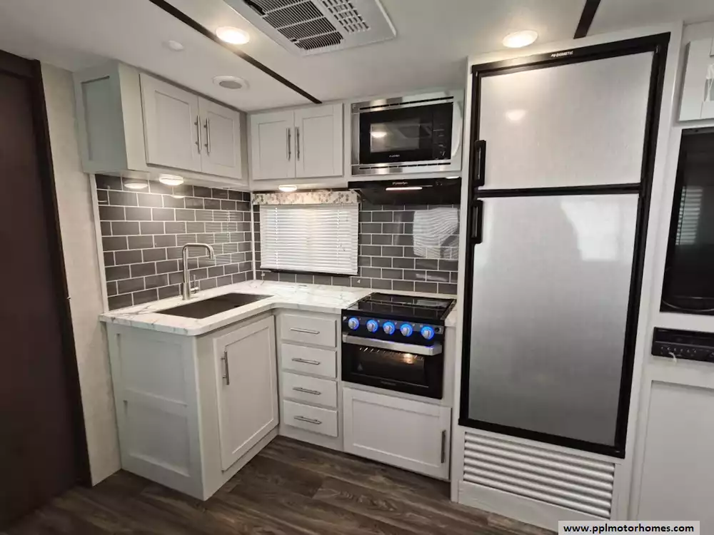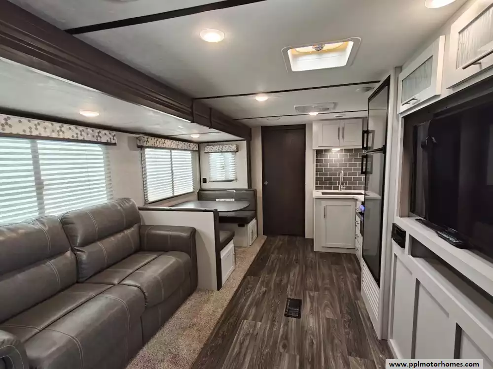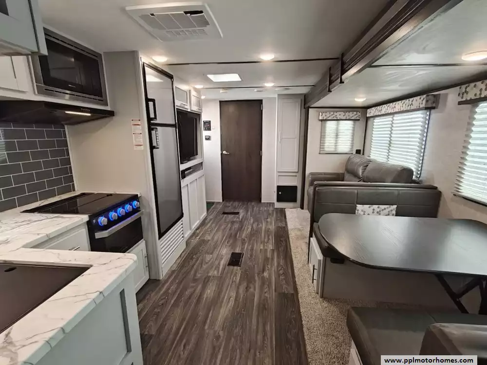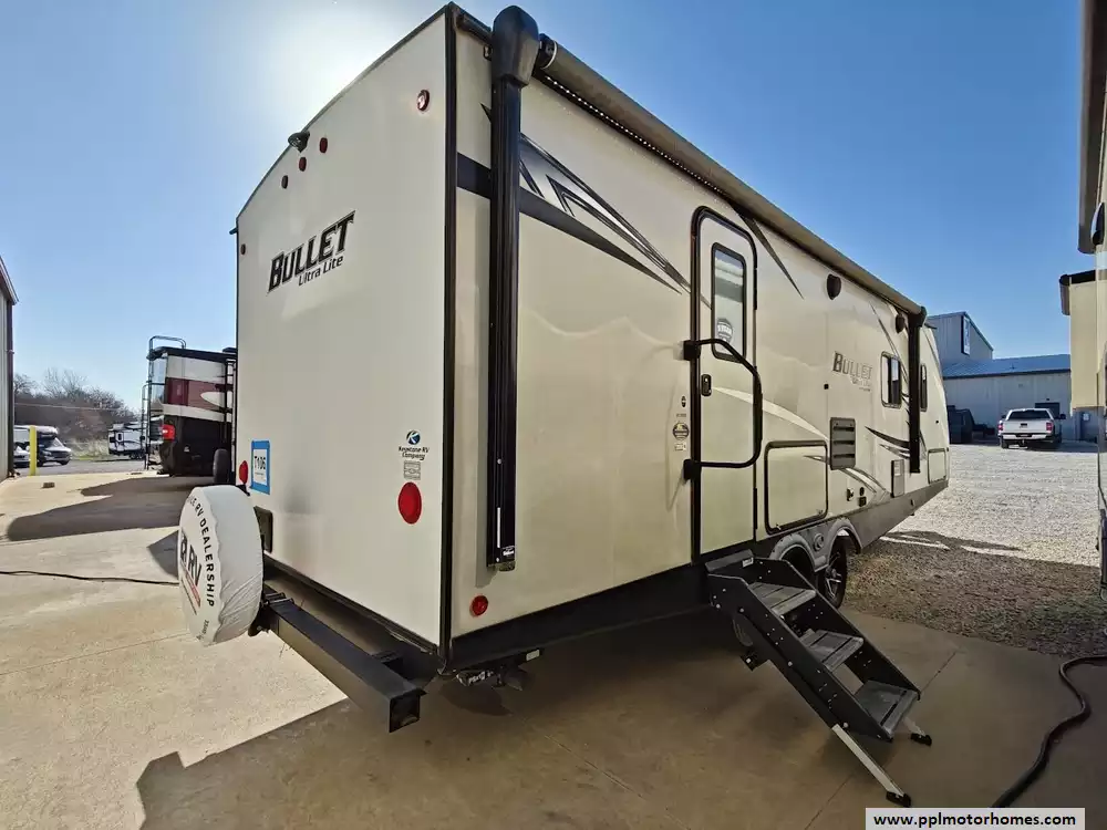 This 2021 Keystone Bullet Ultra Lite 261RBS is a standout in the luxury lightweight category, offering an ideal balance of easy towability and premium features. Built with a sleek fiberglass body and a durable TPO roof, this 31-foot travel trailer is famous for its spacious rear-bath floorplan and high-quality interior finishes that create a coastal, residential feel. The large slide-out creates a wide-open living space where you can enjoy the ducted air conditioning and an entertainment center featuring a TV and DVD player. The kitchen is fully equipped for any trip with a three-burner range, oven, microwave, and a double-door gas/110v Dometic refrigerator, providing all the comforts of home in a package manageable for many light-duty trucks and SUVs.