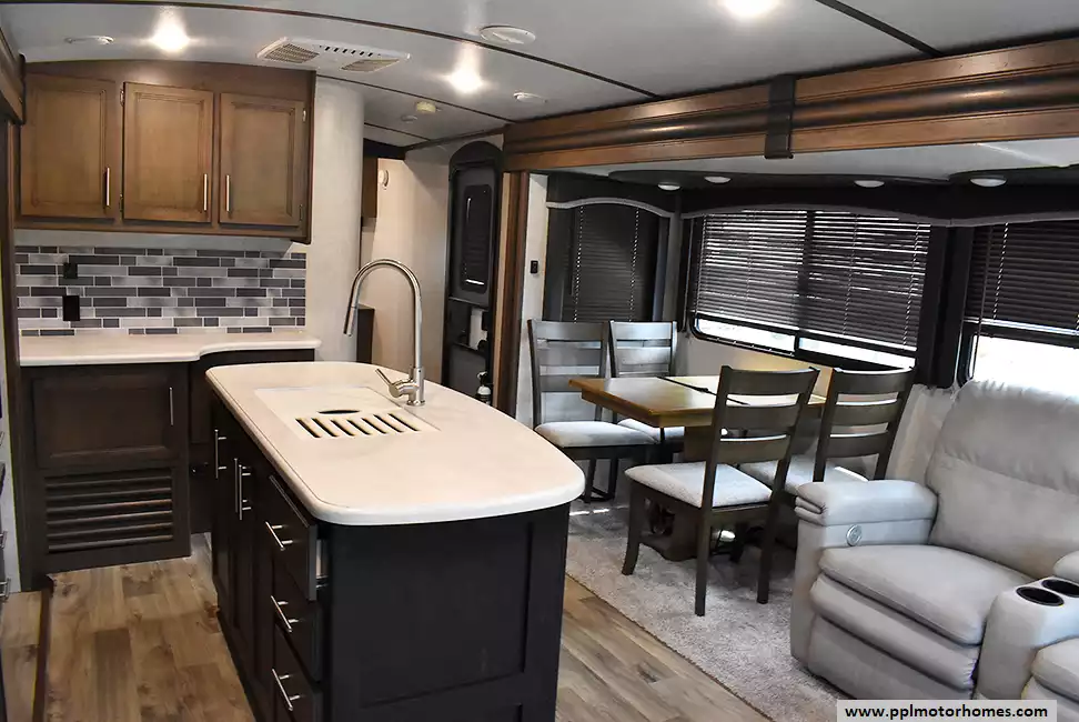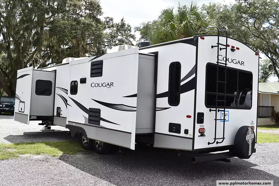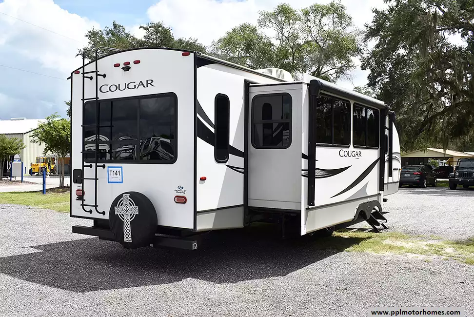 This 2021 Cougar by Keystone 32RLI has an Electric Tongue Jack, 3 Slide-outs, 2 Ducted Air Conditioners, Double Door Gas/12v Dometic Refrigerator, Automatic Main Awning, Outside Speakers, TV, Outside Shower, Fireplace, Microwave, 3 Burner Range, Oven