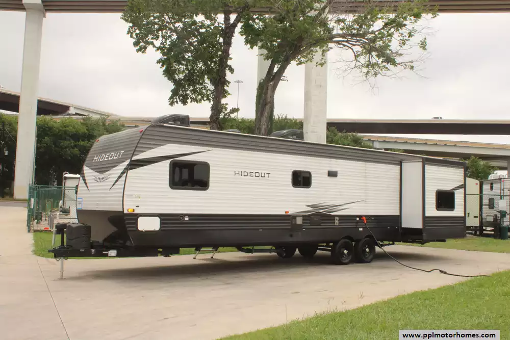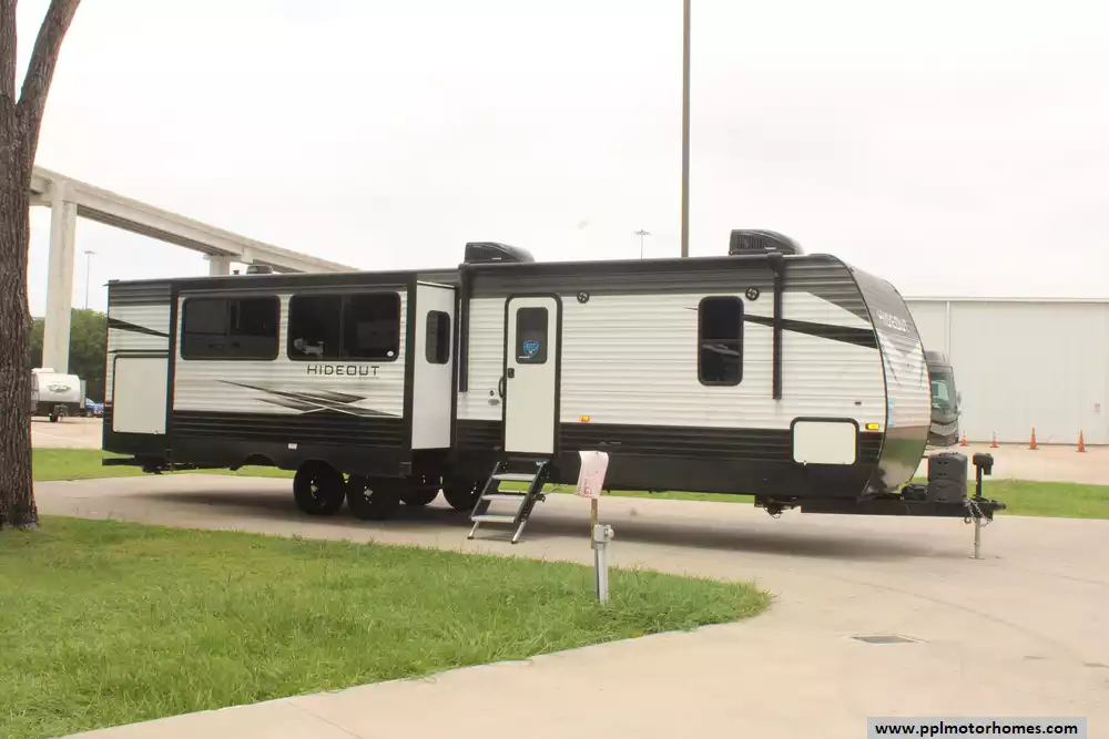 This 2021 Hideout 338BR is a spacious and family-friendly travel trailer designed to accommodate larger groups or families seeking comfort and convenience while camping.Features Include...Electric Tongue Jack, 2 Slide-outs, 1 Non-Ducted And 1 Ducted Air Conditioner, Double Door Gas/110v Norcold Refrigerator, Automatic Main Awning, Outside Speakers,Electric Stabilizers, TV, Outdoor Kitchen, Outside Shower, Central Vacuum, Microwave, 3 Burner Range,and Oven.Its family-friendly layout, ample storage, and comfort features make it a popular option for those seeking a comfortable and convenient home-away-from-home experience while traveling.