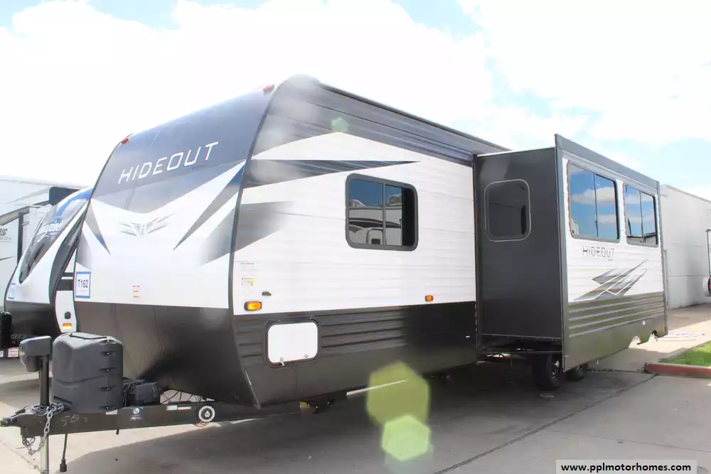 This 2021 Hideout Luxury 29DFS By Keystone Features...An Electric Tongue Jack, 2 Slide-Outs, 1 Non-Ducted And 1 Ducted Air Conditioner, Double Door 12v Norcold Refrigerator, Automatic Main Awning, Outside Speakers, TV, Outdoor Kitchen, Outside Shower, Fireplace, Central Vacuum, Microwave, 3 Burner Range, Oven And More! Bunkhouse Converted To Laundry Room. Ask About PPL's Financing Options!