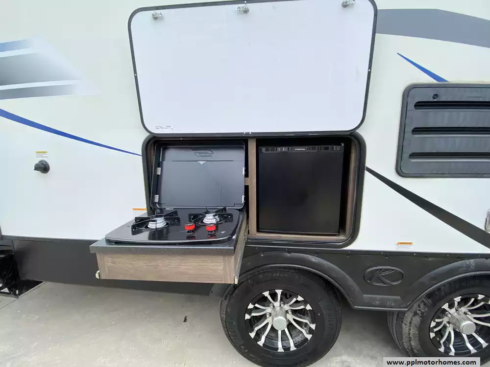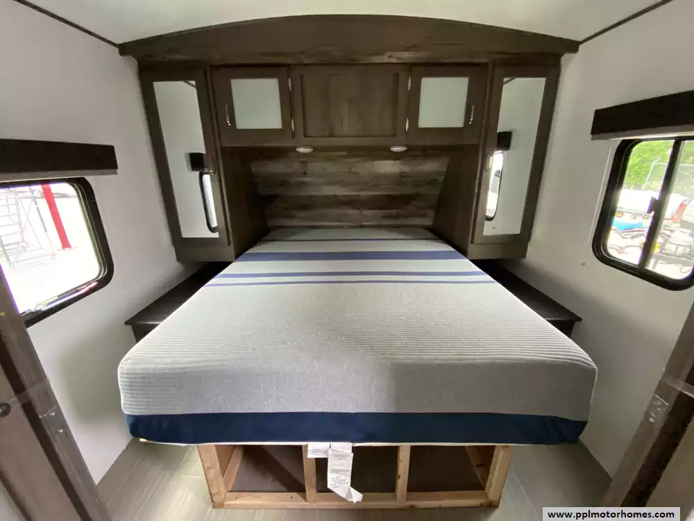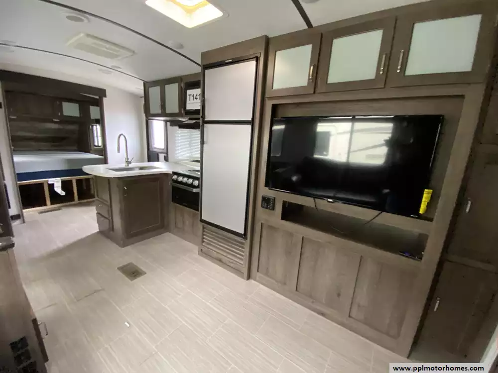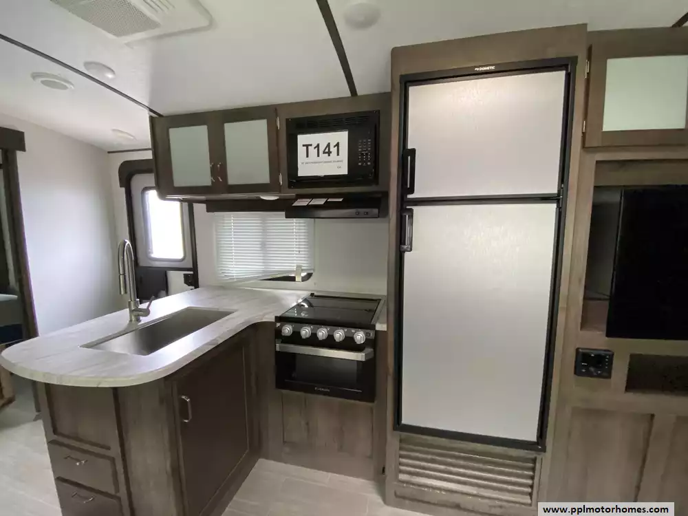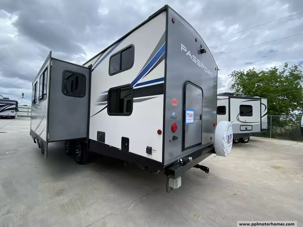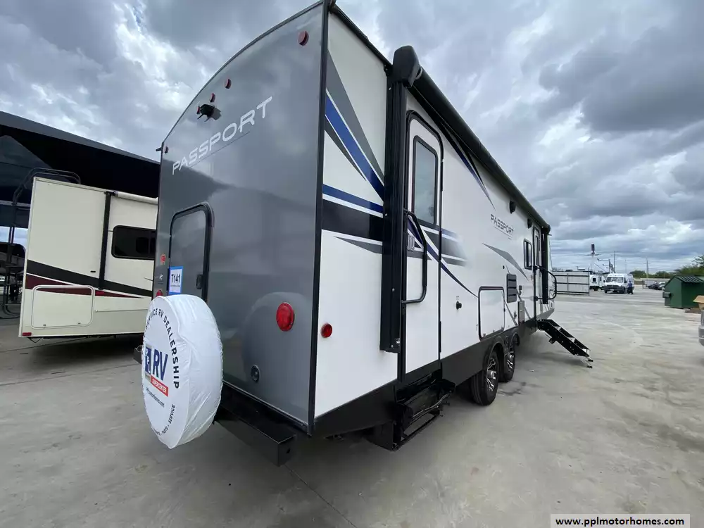 The interior is fully equipped for any culinary need, featuring a three-burner range, oven, microwave, and a double-door Gas/110v Dometic refrigerator. This model truly shines when it comes to outdoor living, boasting an automatic main awning and outside speakers for the ultimate campsite atmosphere. The dedicated outdoor kitchen, complete with an additional refrigerator, allows you to prep meals in the fresh air, while the outside shower makes cleanup a breeze after a day of exploring. Combining Keystone's reputation for innovative, lightweight engineering with high-end amenities, this Passport Grand Touring is ready to help you make the most of every mile.