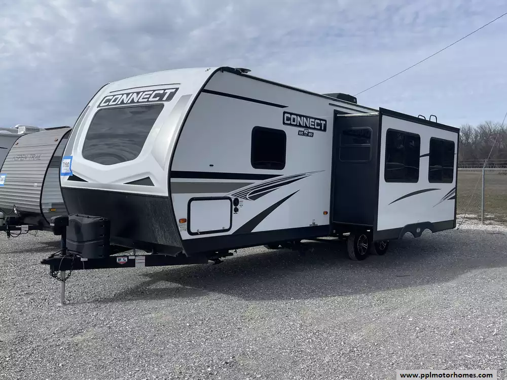 This 2021 Connect 261RKK has an Electric Tongue Jack, 1 Slide-out, 1 Ducted Air Conditioner, Double Door 12v Norcold Refrigerator, Automatic Main Awning And Window/Door Awnings, Outside Speakers, TV, Outside Shower, Fireplace, Microwave, 3 Burner Range, Oven, Back Up Camera Ready , Outside Griddle and Fridge, Double Recliner -Heat and Massage Features, Oversized Pantry/Coat Closet
