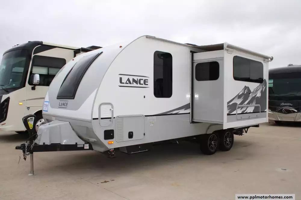 The 2021 Lance 1985 is a well-built, mid-size travel trailer designed for couples or small families seeking a balance of towability and residential comfort, measuring about 23 feet in length and weighing roughly 4,200-4,500 pounds dry, making it suitable for towing with many half-ton trucks or larger SUVs. Its standout feature is a full-width rear bathroom, offering a spacious layout uncommon in trailers of this size, while the interior includes the optional front queen sofa bed, and a large U-shaped "Super Slide" dinette that expands the living area.
