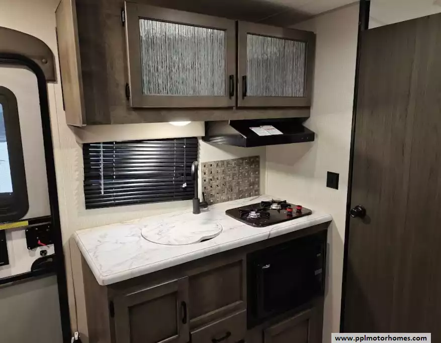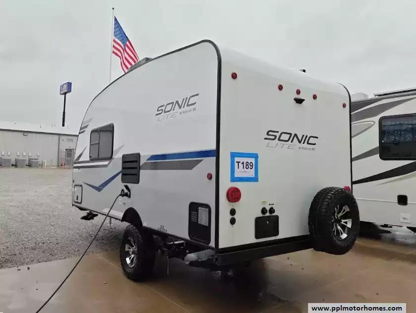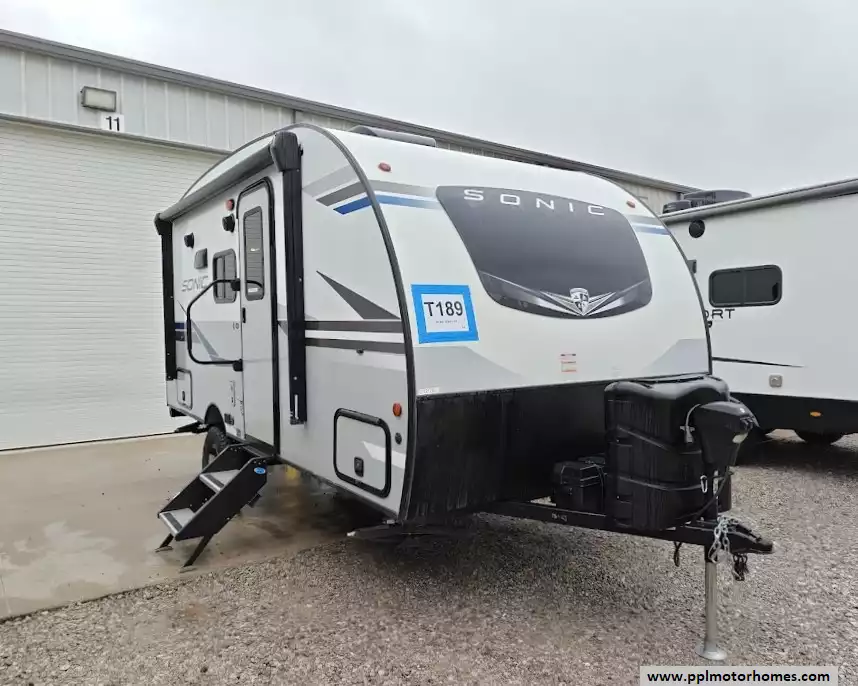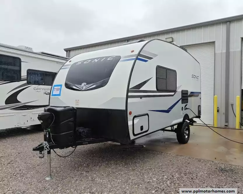 This 2021 Sonic Lite 150VRB sleeps up to 2 people, has an Electric Tongue Jack, 1 Non-Ducted Air Conditioner, Double Door Gas/110v Dometic Refrigerator, Main Awning, TV, Outside Shower, Microwave, 2 Burner Range