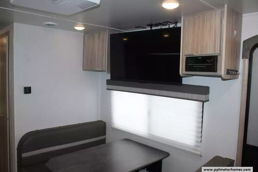Setting up camp is simpler than ever thanks to the electric tongue jack and an automatic main awning that provides instant shade at the touch of a button. This particular unit is uniquely equipped for maximum climate control, featuring a powerful triple-AC setup consisting of one ducted and two non-ducted air conditioners to keep you cool in any weather. Premium amenities like the double door 12v refrigerator, convection microwave, and included TV ensure all the comforts of home are always within reach. Whether you are relaxing inside or enjoying the outside speakers under the awning, this Minnie is engineered to provide a first-class camping experience.
