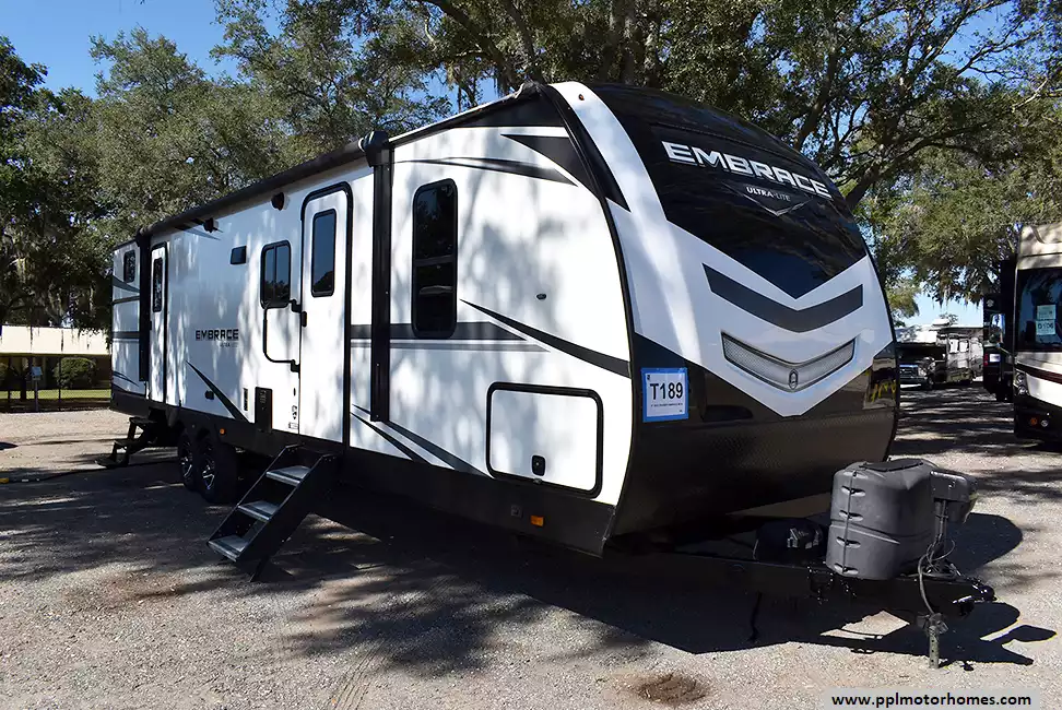 This 2022 Embrace Ultra Lite Series M310 has an Electric Tongue Jack, 2 Slide-outs, 1 Ducted Air Conditioner, Double Door 12v Everchill Refrigerator (Additional Refrigerator Present), Automatic Main Awning And Slide Awning, Outside Speakers, TV, Outdoor Grill, Outdoor Kitchen, Microwave, 3 Burner Range, Oven