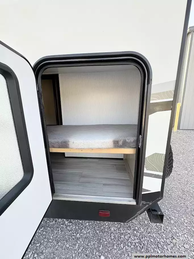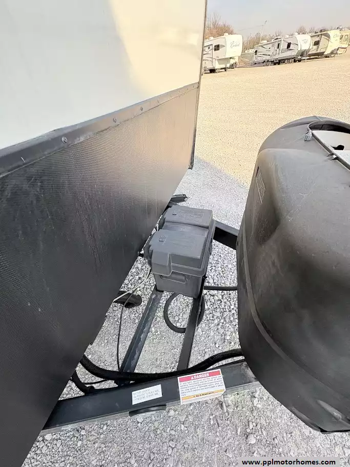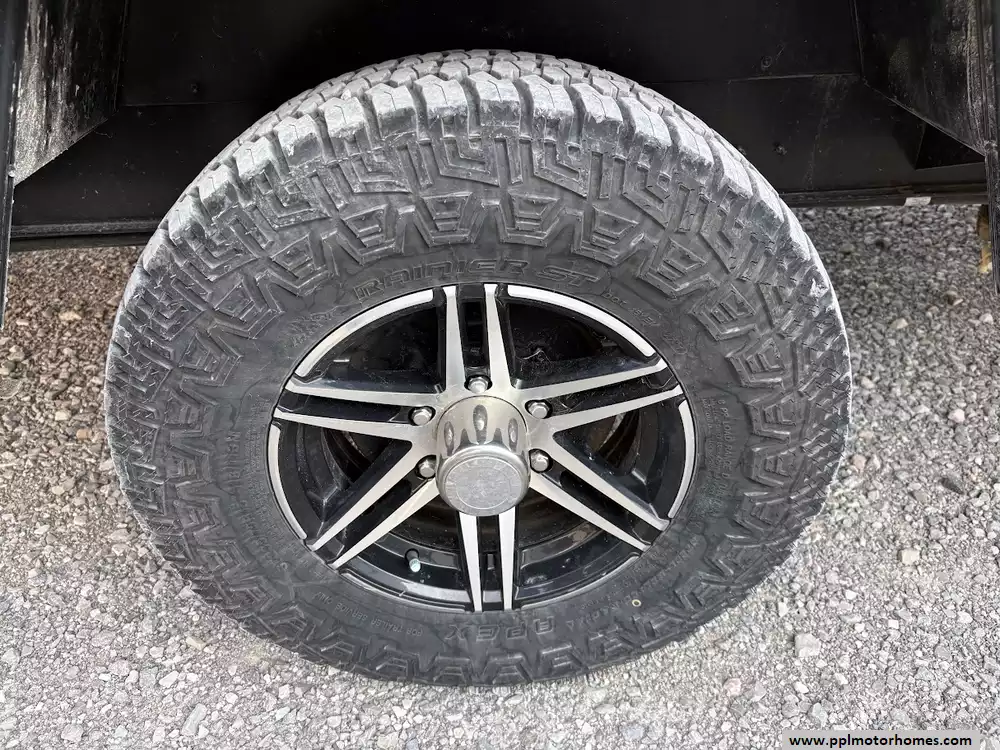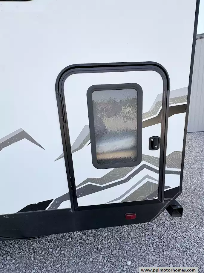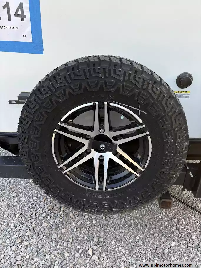 Outside you will find a power awning with LED lighting, large pass-through storage, exterior speakers, pet friendly leash D-rings and all terrain tires.