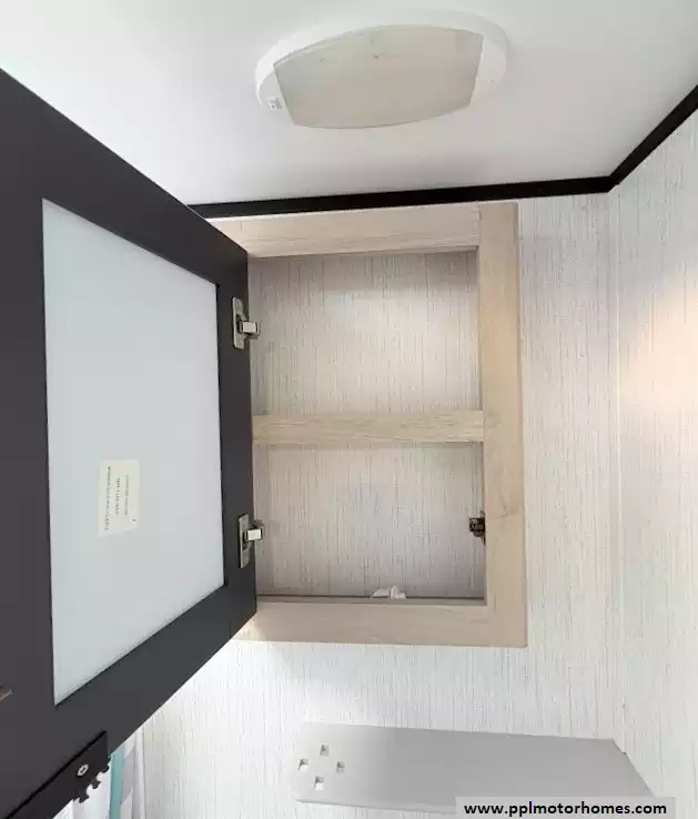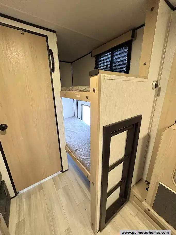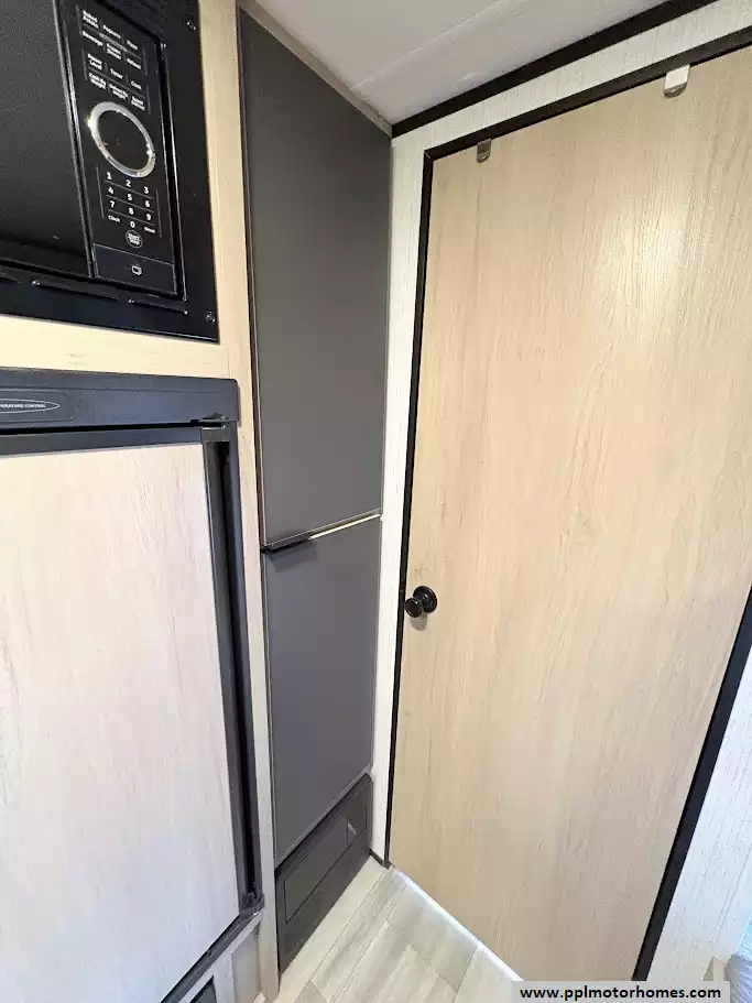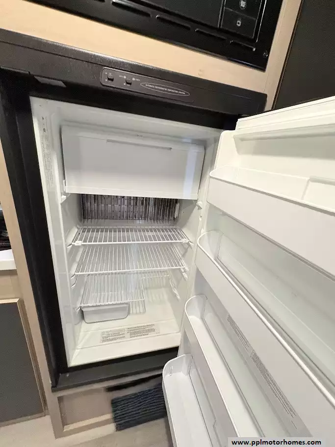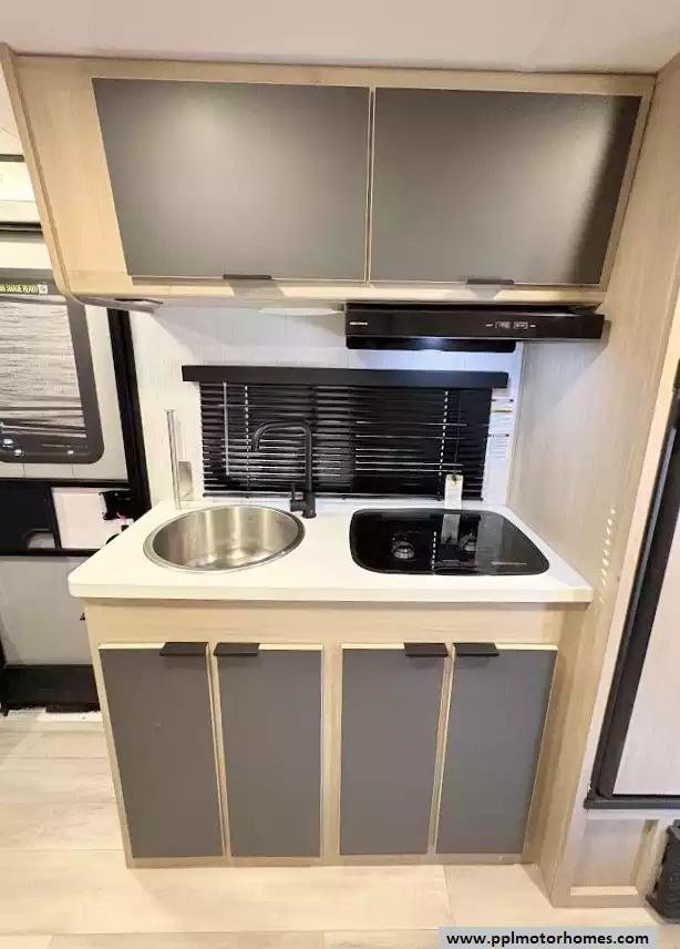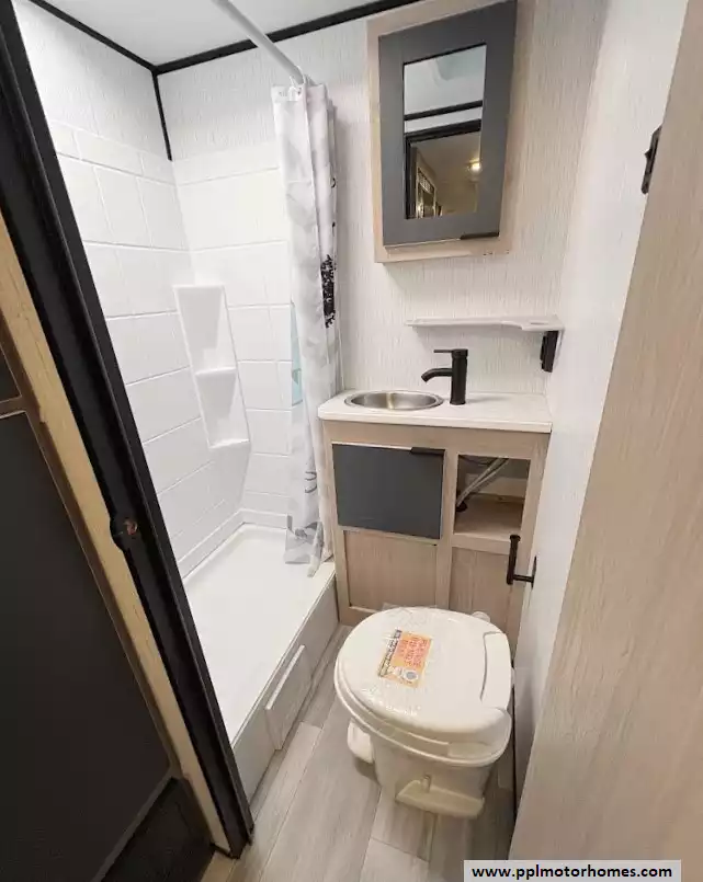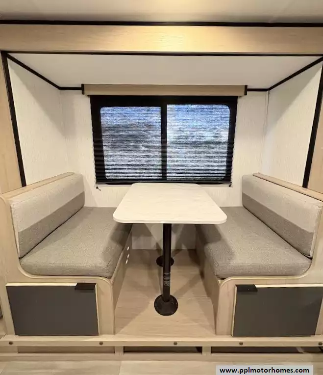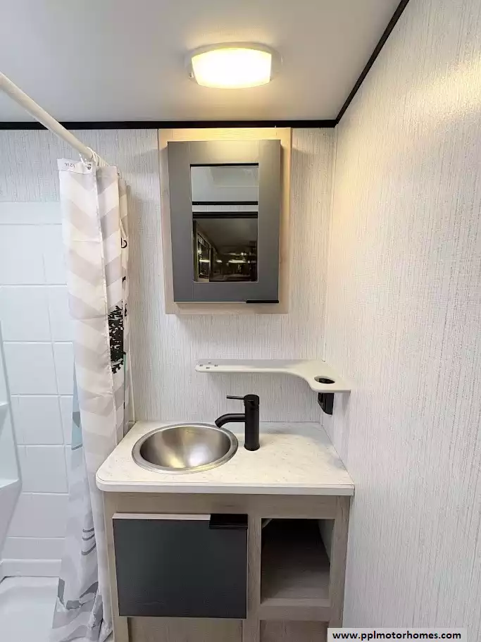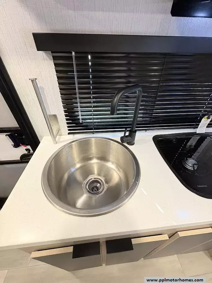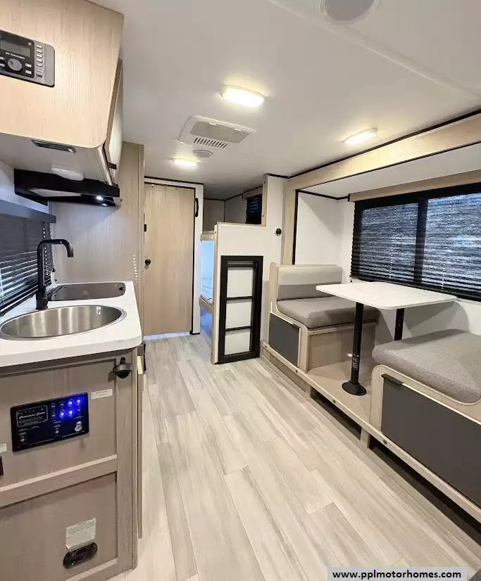 The interior used two-toned modern style cabinetry, water resistant flooring and a barreled roof. The kitchen includes solid surface countertops, round stainless- steel sink, single door refrigerator, under dinette storage and a dedicated pantry for food storage. The bathroom is located in the rear of the RV and comes with a standard shower, toilet, sink and power vent.