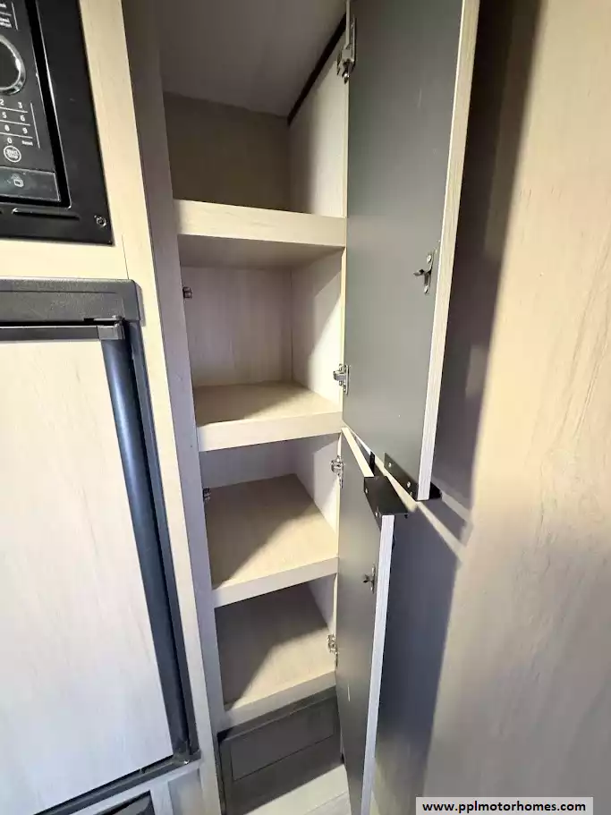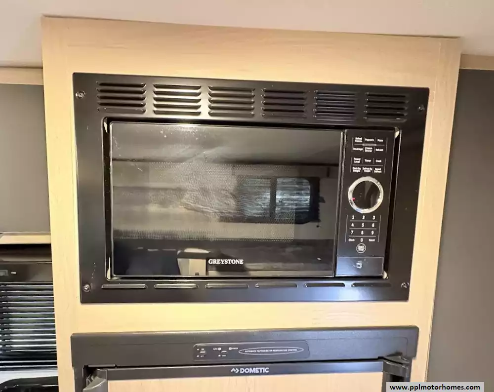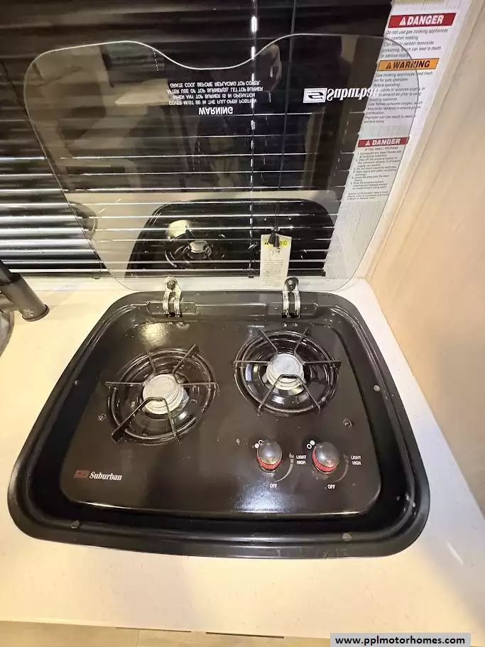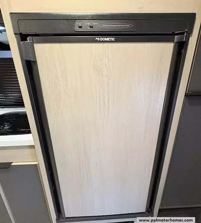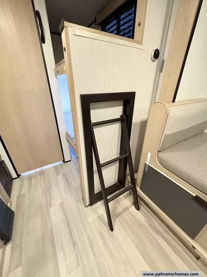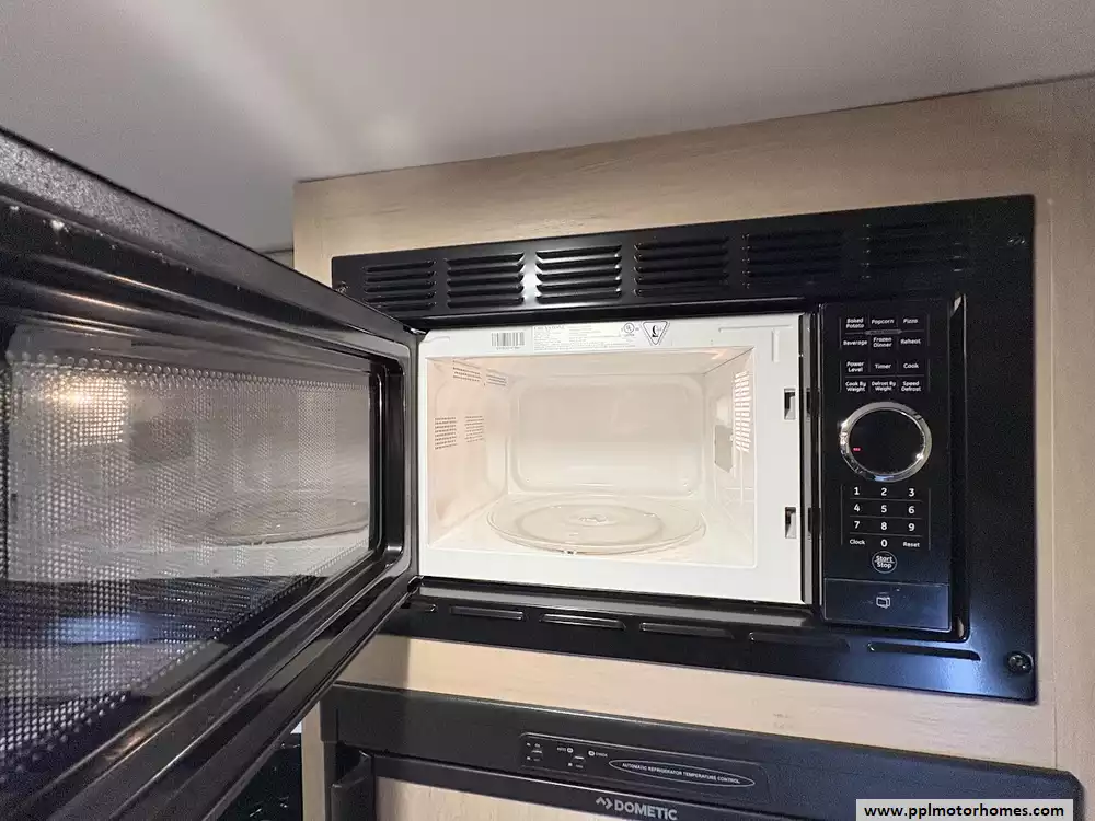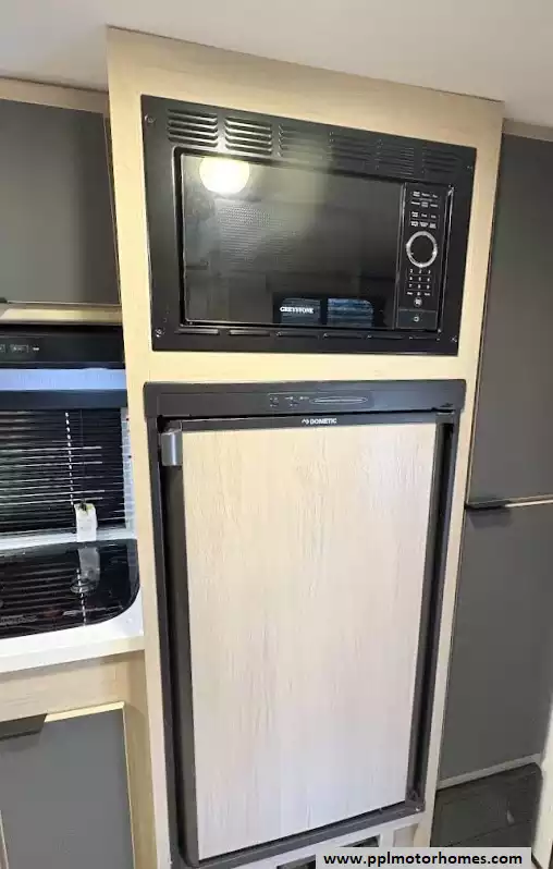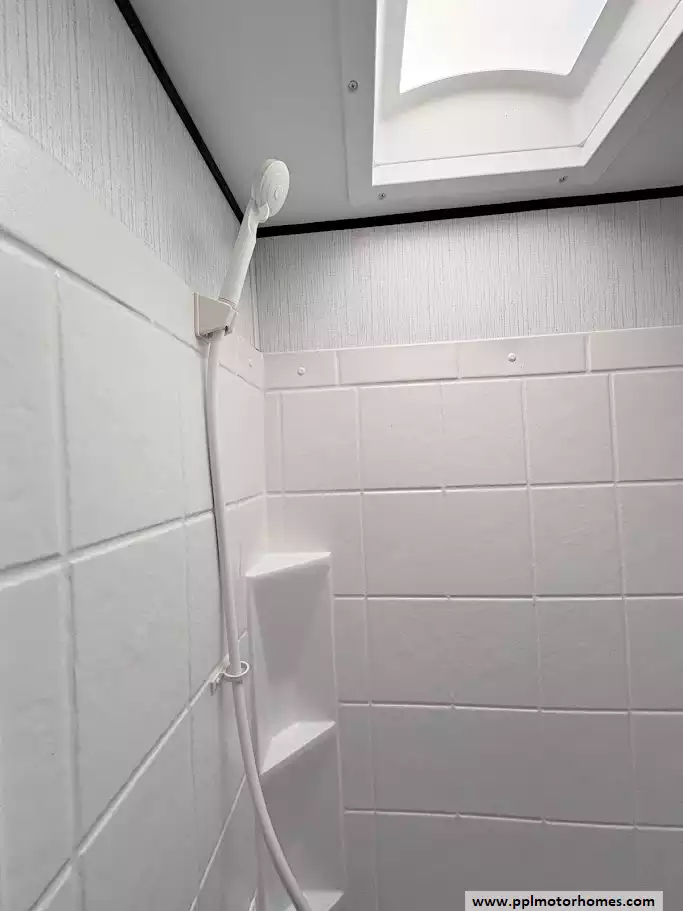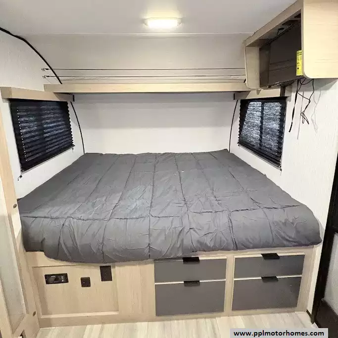 The interior used two-toned modern style cabinetry, water resistant flooring and a barreled roof. The kitchen includes solid surface countertops, round stainless- steel sink, single door refrigerator, under dinette storage and a dedicated pantry for food storage. The bathroom is located in the rear of the RV and comes with a standard shower, toilet, sink and power vent.