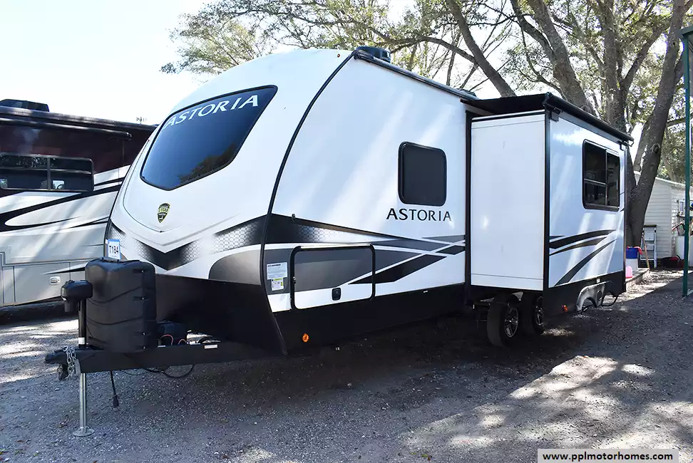 This 2022 Astoria 2203RB has an Electric Tongue Jack, 1 Slide-out, 1 Ducted Air Conditioner, Double Door 12v Ge Refrigerator, Automatic Main Awning, Outside Speakers, TV, Outside Shower, Fireplace, Microwave, 3 Burner Range, Oven
