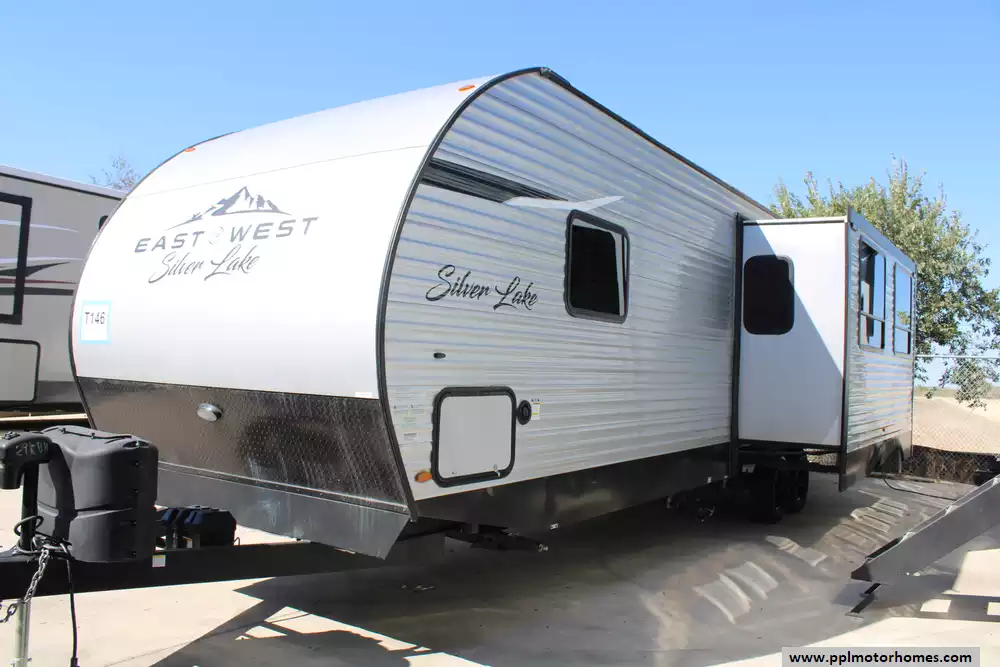 This 2022 Silverlake 29KBH has an Electric Tongue Jack, 1 Slide-out, 1 Ducted Air Conditioner, Double Door Gas/110v Dometic Refrigerator (Additional Refrigerator Present), Automatic Main Awning, Outside Speakers, TV, Outdoor Grill, Outside Shower, Fireplace, Microwave, 3 Burner Range, Oven