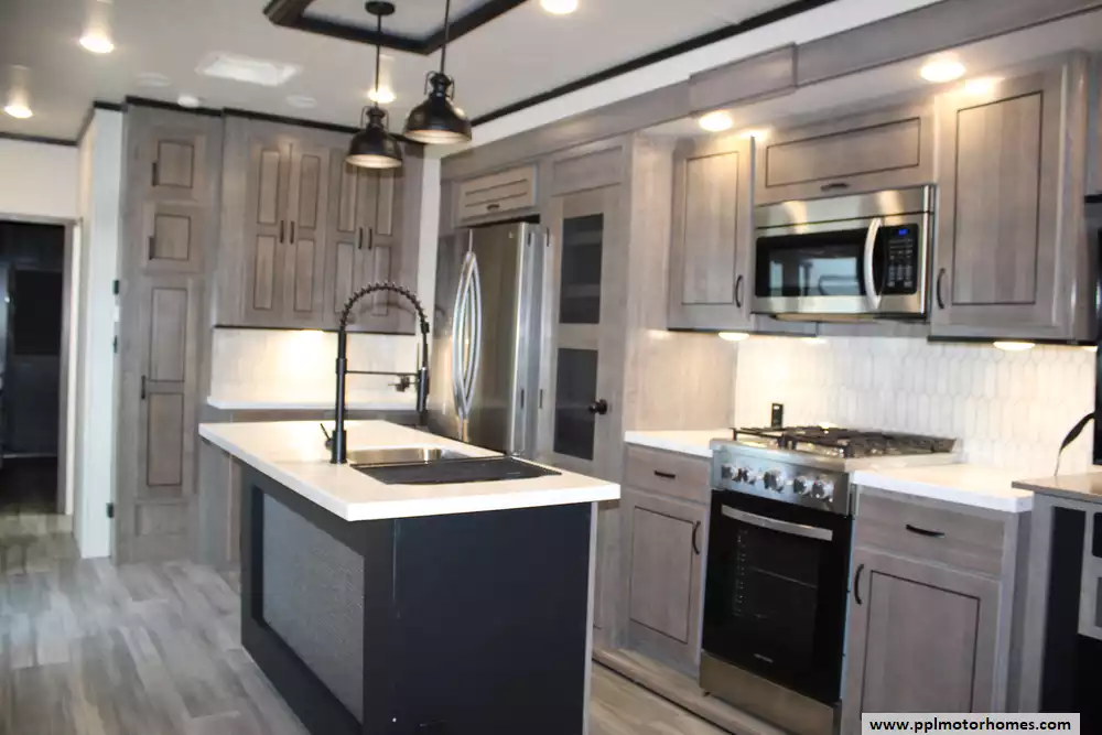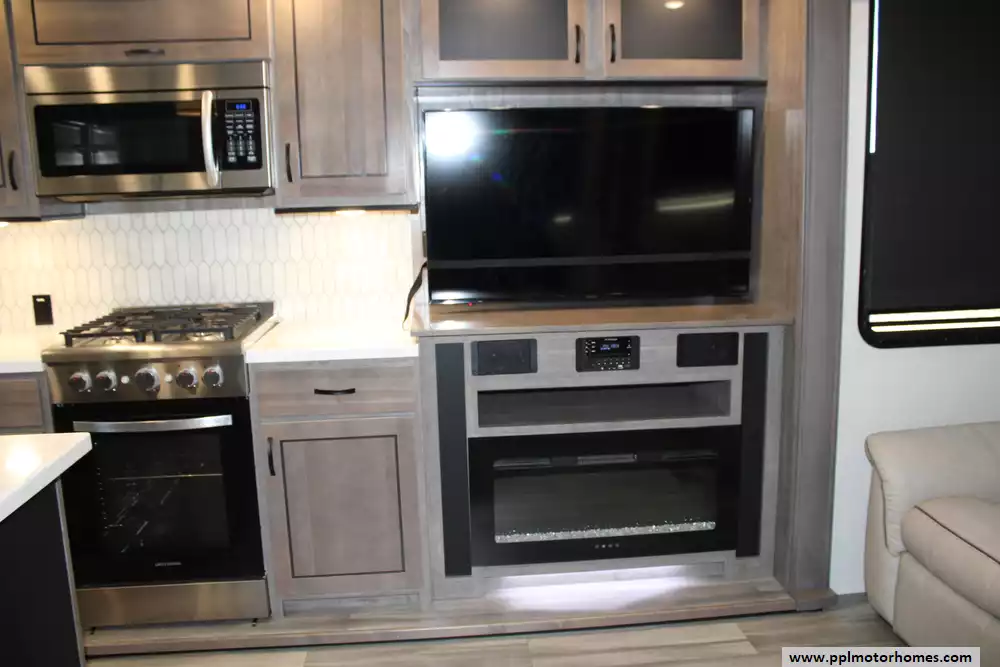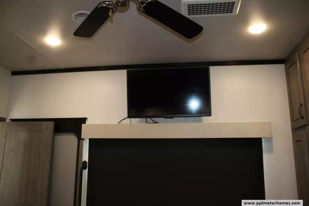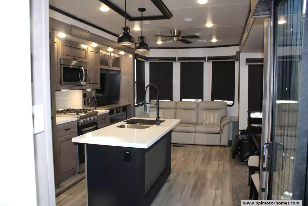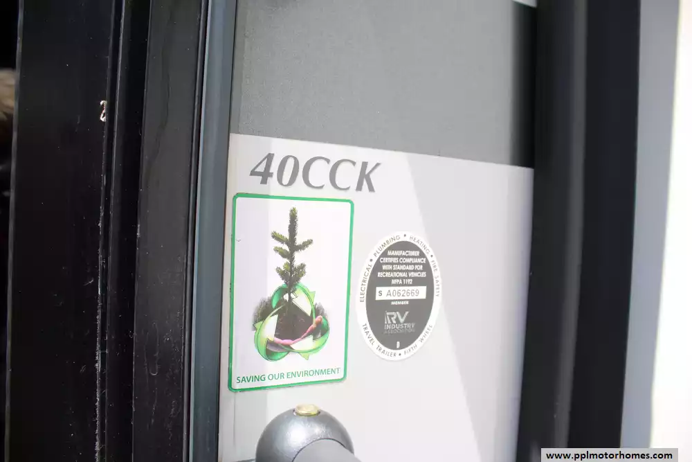 The 2022 Cedar Creek Cottage 40CCK is a luxury destination trailer crafted by Forest River for those seeking upscale comfort in a residential-style RV. Built on a sturdy aluminum superstructure with a gelcoat exterior and bonded slide walls, it features three expansive slides, dual-pane front windows, an 18-foot electric awning with LED lighting, and dual 15,000 BTU A/C units with a 20 gal electric water heater, all designed for extended stays. The spacious front living area offers a hide-a-bed sofa, power theater recliners, a fireplace, and a 50" smart TV. The center kitchen includes an island with solid-surface counters, a full-size stainless steel fridge with icemaker, pantry, free-standing dinette, 4-burner oven, and optional dishwasher. In the rear, a private bedroom boasts a king bed, shiplap accents, ample storage, washer/dryer prep, and a 32" TV. A full bath with a 48x30 shower, vessel sink, and porcelain toilet completes the layout. With a GVWR around 14,000 lb, fresh/gray/black tanks of 76/82/41 gal, and premium comforts like central vacuum, power awning, and smart tech readiness, the 40CCK blends rugged build quality with refined lodge-style living.