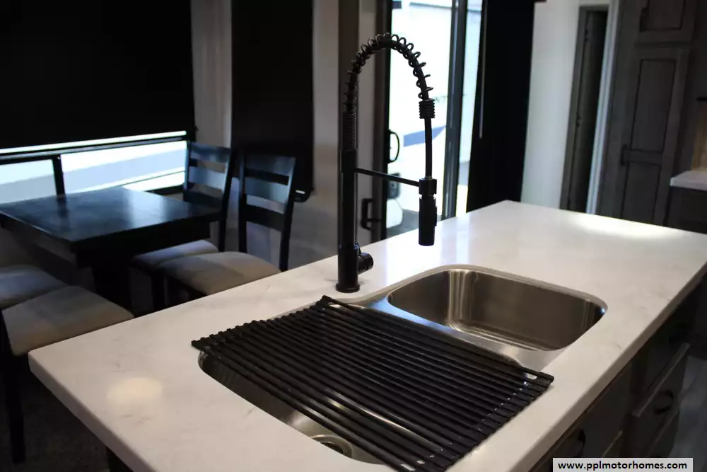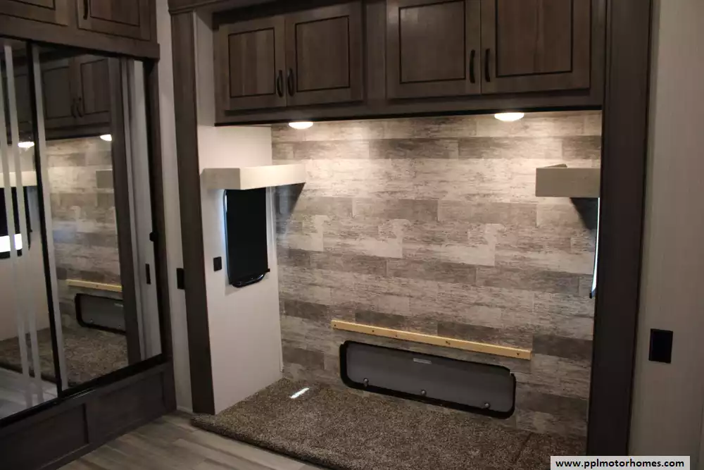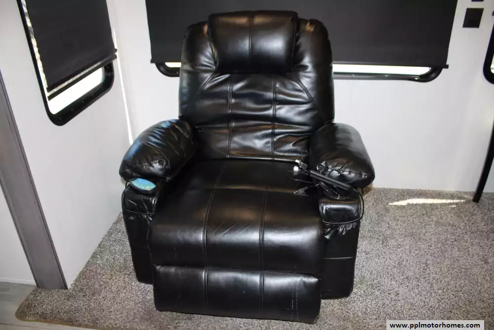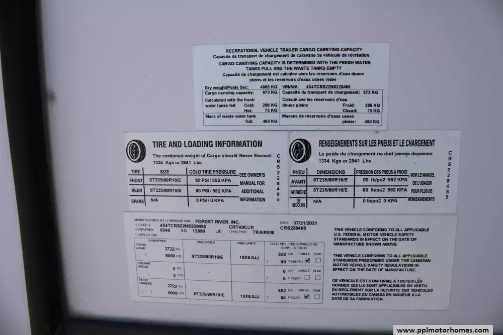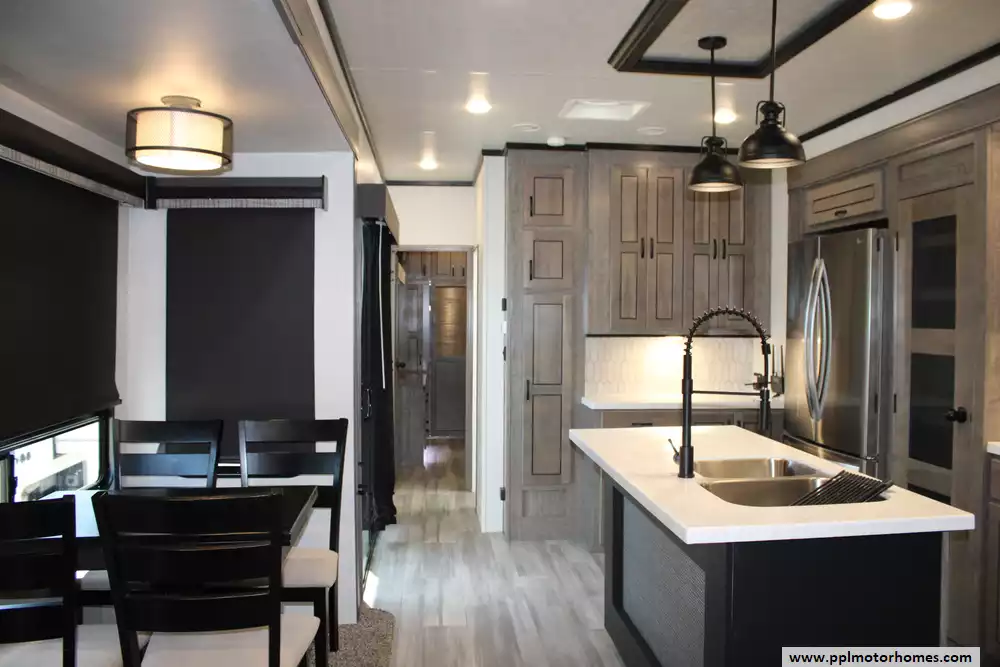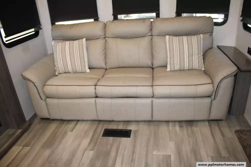 The 2022 Cedar Creek Cottage 40CCK is a luxury destination trailer crafted by Forest River for those seeking upscale comfort in a residential-style RV. Built on a sturdy aluminum superstructure with a gelcoat exterior and bonded slide walls, it features three expansive slides, dual-pane front windows, an 18-foot electric awning with LED lighting, and dual 15,000 BTU A/C units with a 20 gal electric water heater, all designed for extended stays. The spacious front living area offers a hide-a-bed sofa, power theater recliners, a fireplace, and a 50" smart TV. The center kitchen includes an island with solid-surface counters, a full-size stainless steel fridge with icemaker, pantry, free-standing dinette, 4-burner oven, and optional dishwasher. In the rear, a private bedroom boasts a king bed, shiplap accents, ample storage, washer/dryer prep, and a 32" TV. A full bath with a 48x30 shower, vessel sink, and porcelain toilet completes the layout. With a GVWR around 14,000 lb, fresh/gray/black tanks of 76/82/41 gal, and premium comforts like central vacuum, power awning, and smart tech readiness, the 40CCK blends rugged build quality with refined lodge-style living.