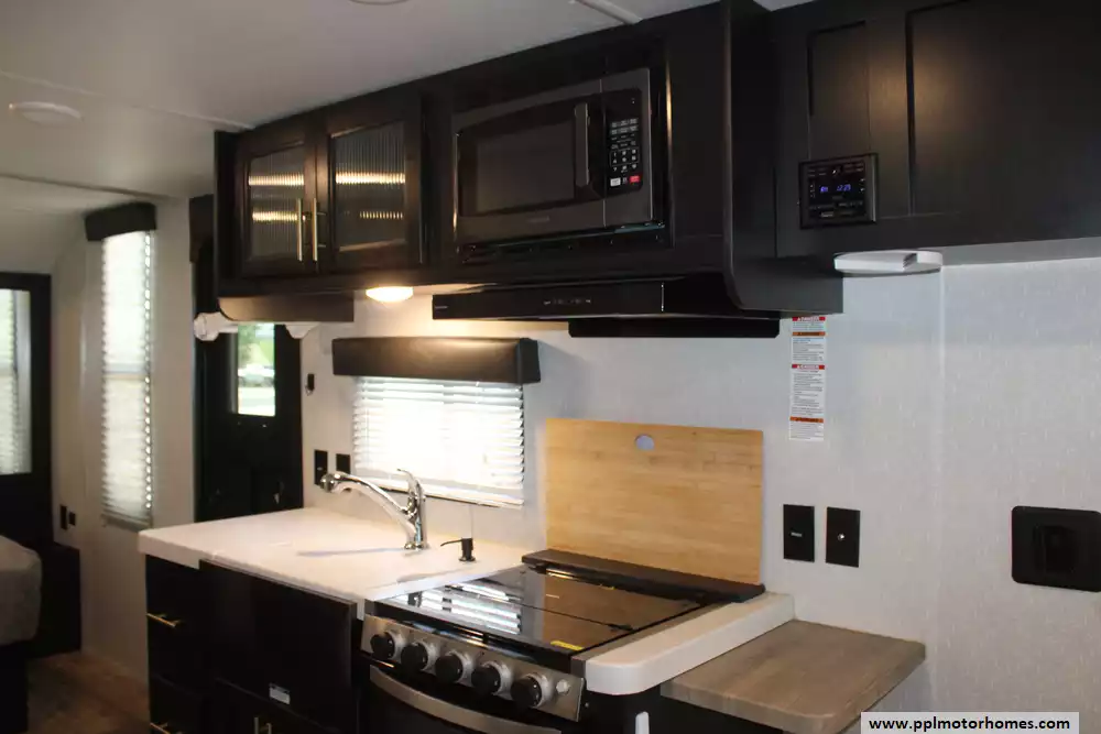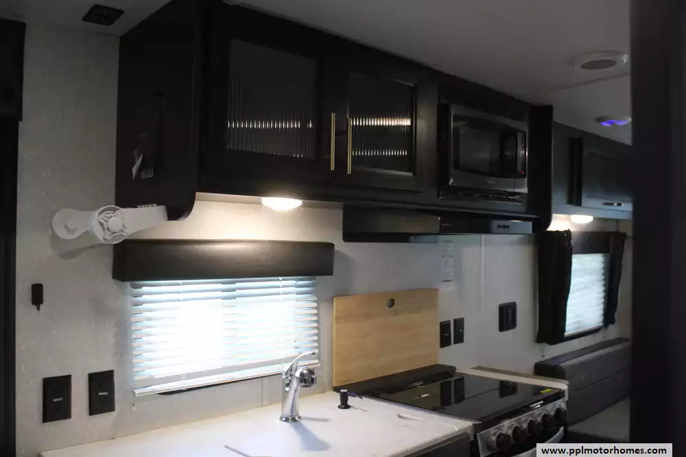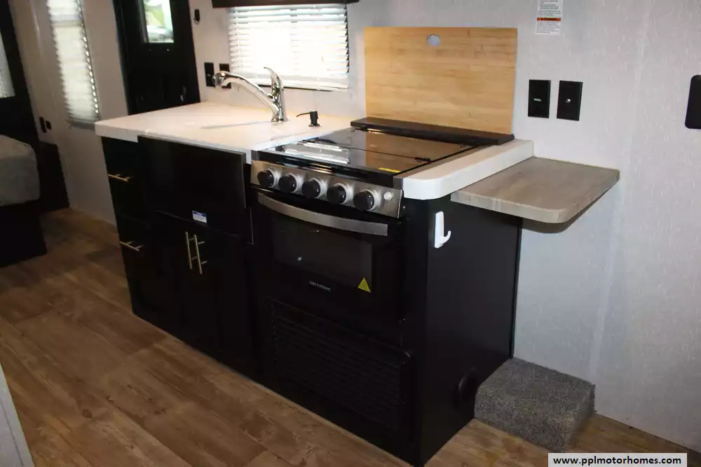 Equipped for modern convenience, this unit features a factory-installed solar panel and a 12v Everchill double-door refrigerator to keep you prepared wherever the road leads. The chef-ready kitchen includes a three-burner range, oven, and microwave, while the ducted air conditioning and included TV provide total climate control and entertainment inside. Setting up camp is effortless thanks to the electric tongue jack and automatic main awning, allowing you to quickly transition to the outdoors where you can enjoy the outside speakers and convenient exterior shower. With its blend of rugged construction and residential-style amenities, this Grey Wolf SE is ready to elevate your next outdoor adventure.