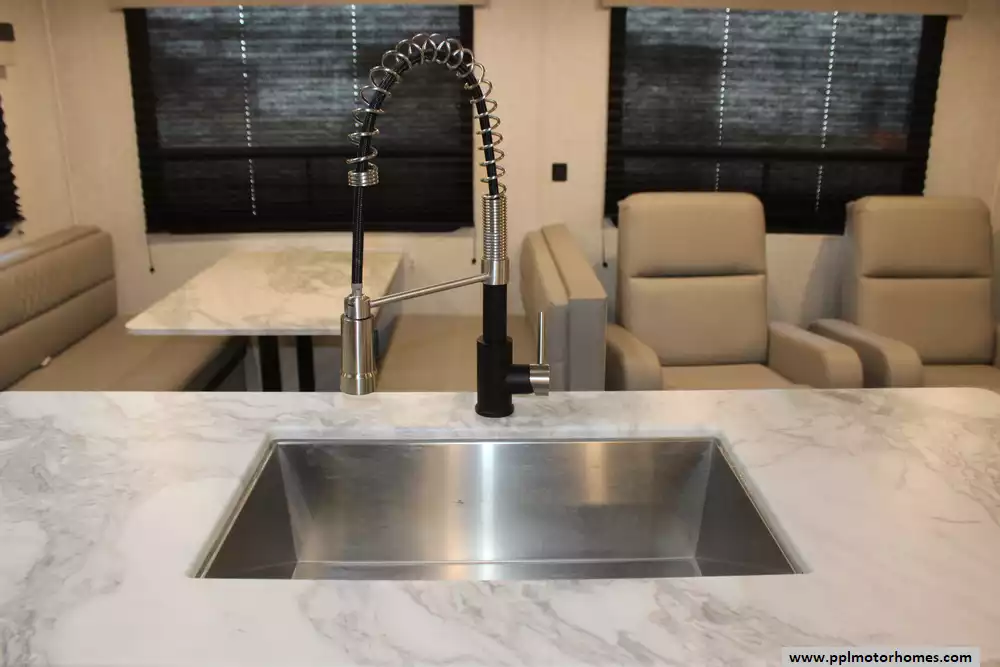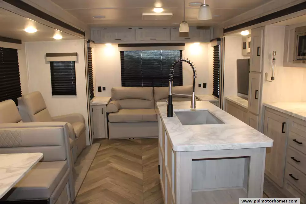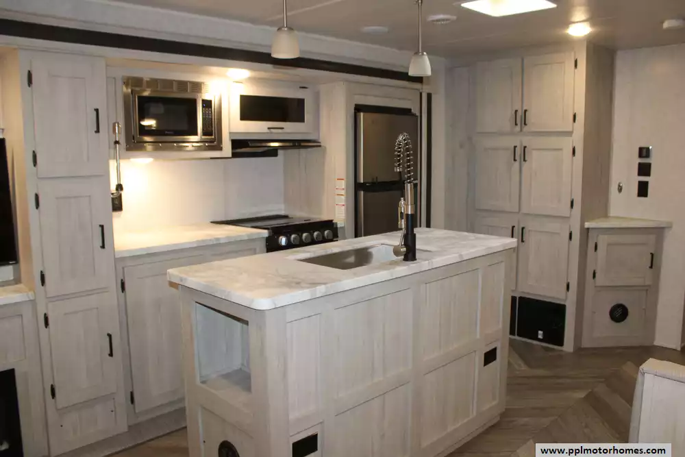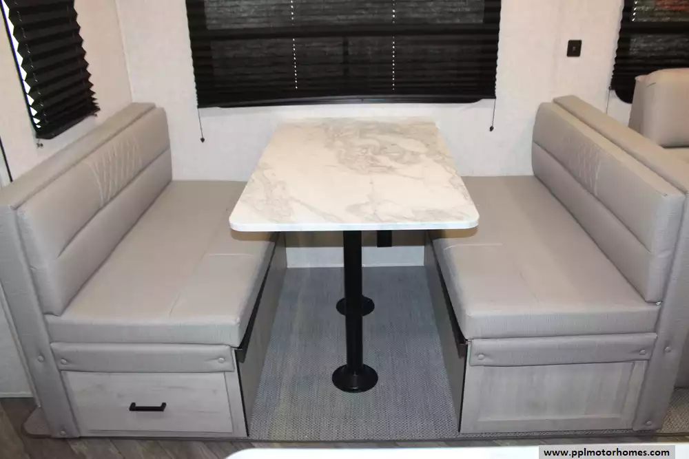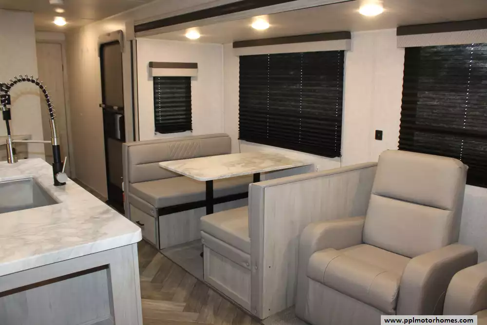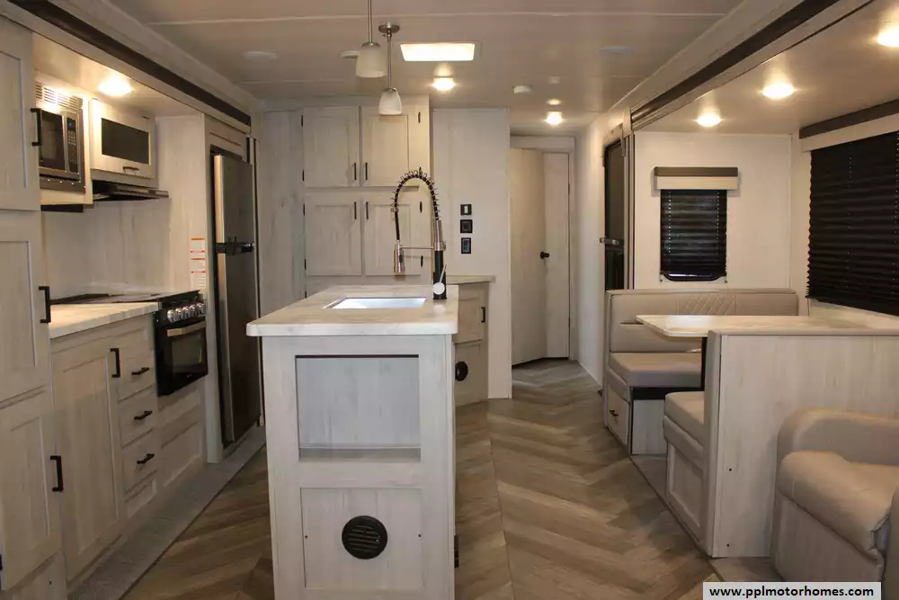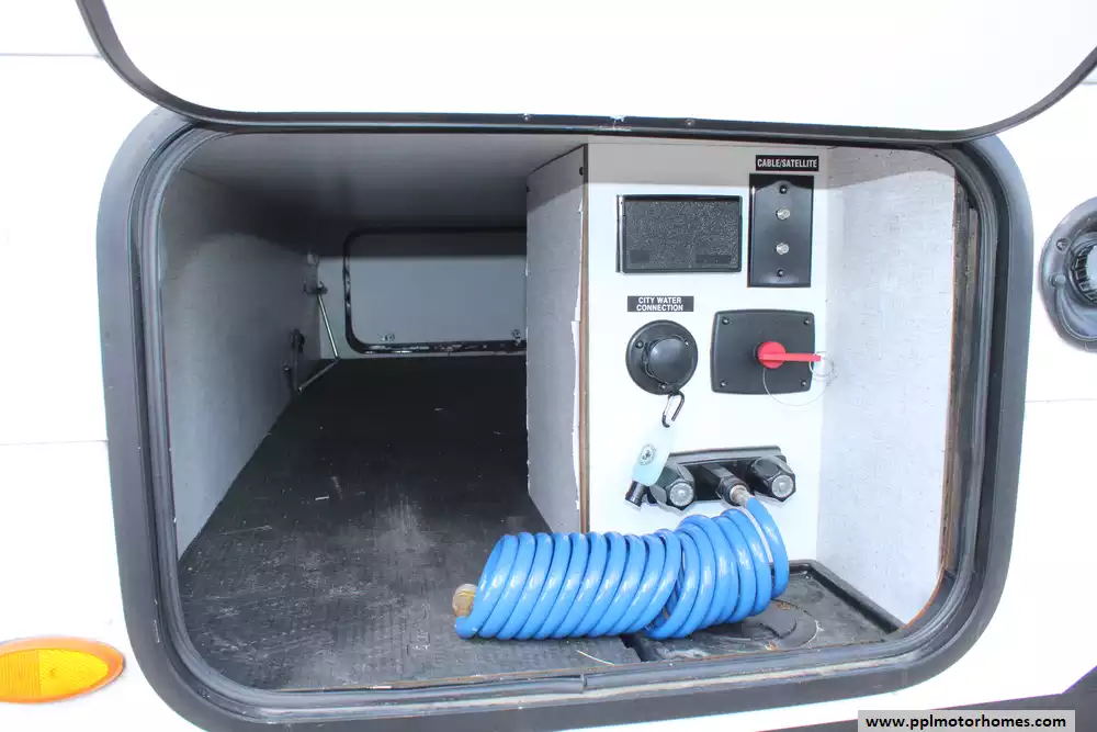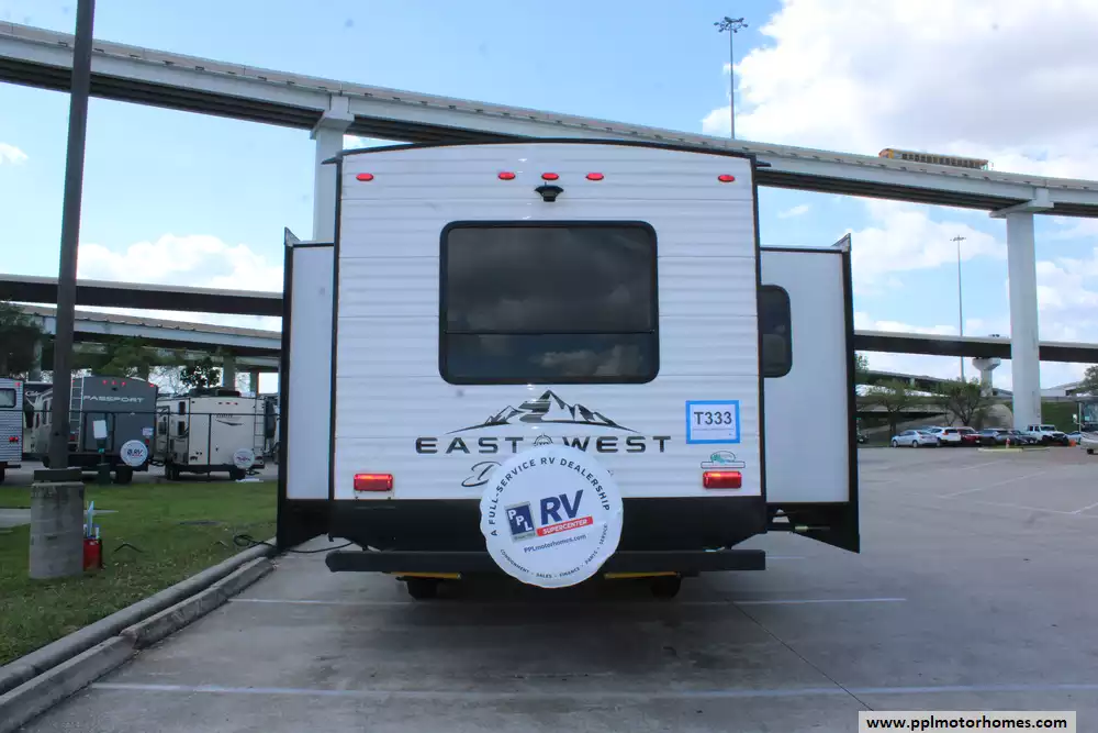 Setup and outdoor living are effortless thanks to the electric tongue jack and an automatic main awning that quickly transforms your campsite into a functional patio. You can enjoy your favorite music through the integrated outside speakers or utilize the convenient outside shower for easy cleanup after a day of adventure. East To West has earned a stellar reputation for combining sustainable manufacturing with premium floor plans, and this 292MK stands as a prime example of their commitment to craftsmanship and user-friendly design. With its generous storage and upscale amenities, this well-appointed trailer is ready to deliver a first-class camping experience for your next getaway.