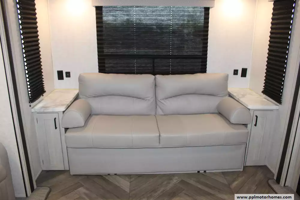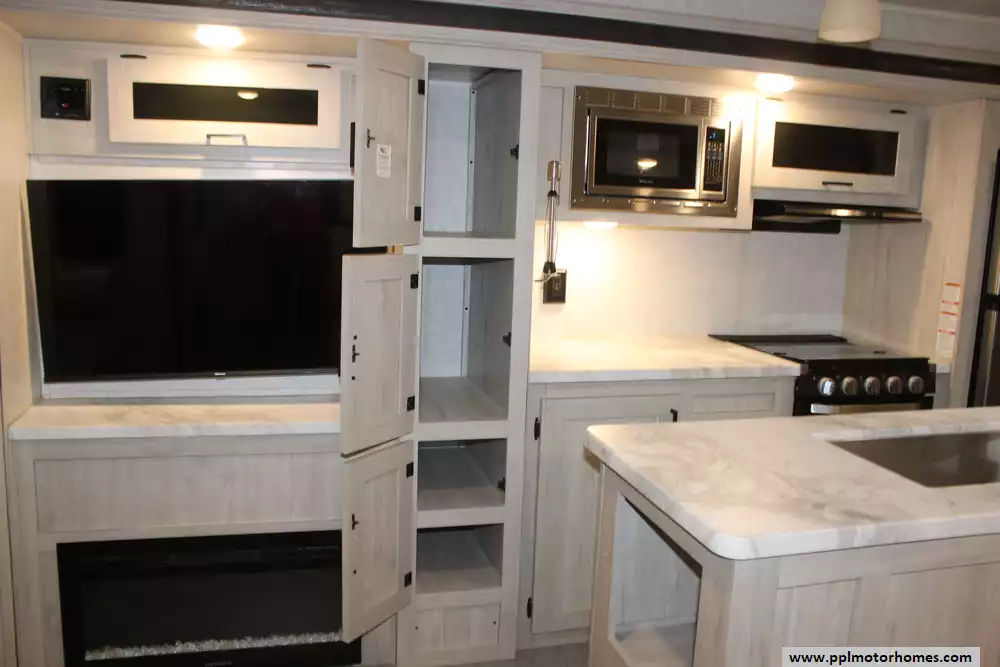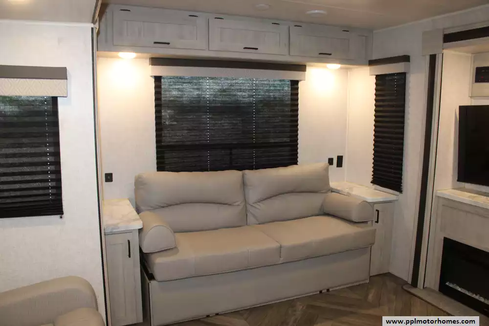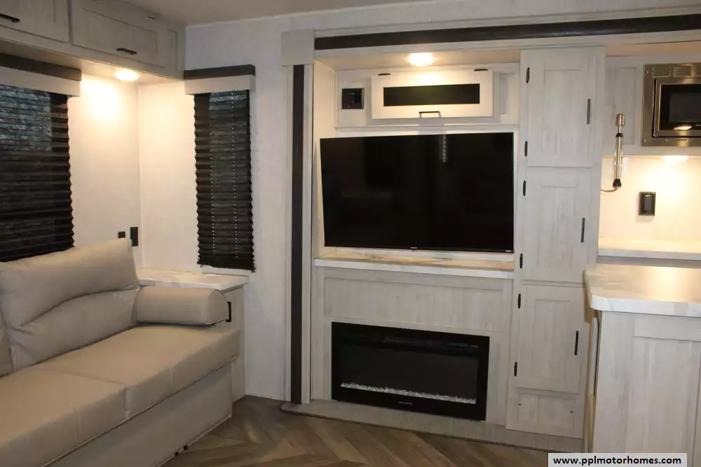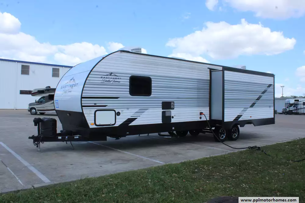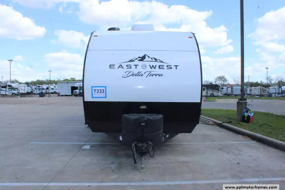 Experience the perfect blend of residential comfort and rugged durability with this 2022 East To West Della Terra 292MK. Renowned for its high-quality fiberglass construction, durable rubber roof, and signature tall ceilings, this 35-foot travel trailer offers an exceptionally spacious environment powered by two large slide-outs. The interior is designed for climate-controlled comfort in any season, featuring both a ducted and a non-ducted air conditioner, along with a cozy fireplace that serves as the centerpiece of the living area. Whether you are relaxing in front of one of the two included TVs or preparing a meal in the chef-inspired kitchen-fully equipped with a three-burner range, oven, microwave, and a double-door Magic Chef refrigerator-this model provides all the modern conveniences of home.