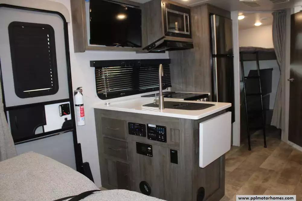 This adventure-ready unit is built for convenience, featuring a factory-installed solar panel and an electric tongue jack for effortless setup at any campsite. The exterior is designed for premium outdoor living with an automatic main awning, outside speakers, and a comprehensive outdoor kitchen complete with a grill and outside shower. Topped with a reliable rubber roof and including an interior entertainment center with a TV, this Micro Lite lives up to its reputation for superior build quality and smart space management. It is an exceptional choice for those seeking a high-quality, easy-to-tow RV that does not compromise on modern amenities.