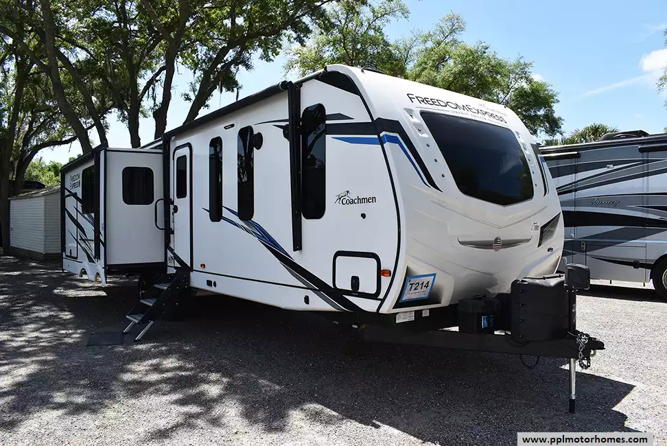 This 2022 Freedom Express LIBERTY 324 RLE has an Electric Tongue Jack, 3 Slide-outs, 1 Ducted Air Conditioner, Double Door 12v Everchill Refrigerator (Additional Refrigerator Present), Automatic Main Awning And Slide Awning, Outside Speakers, 2 TVs, DVD Player, Outdoor Grill, Outdoor Kitchen, Outside Shower, Fireplace, Microwave, 3 Burner Range, Oven
