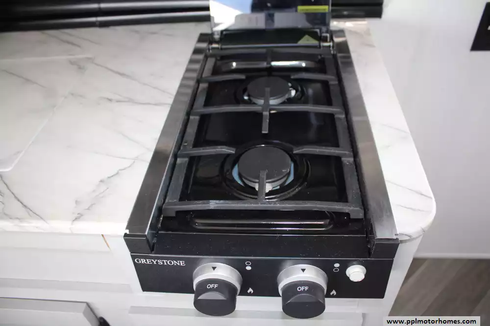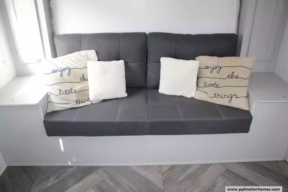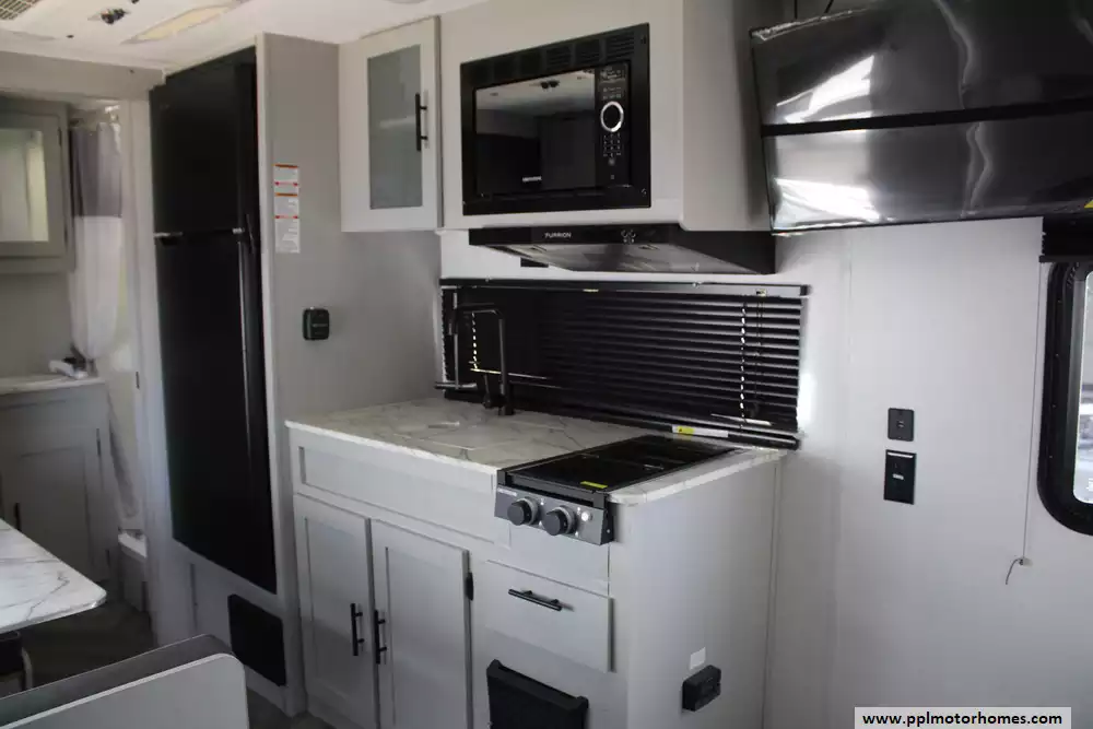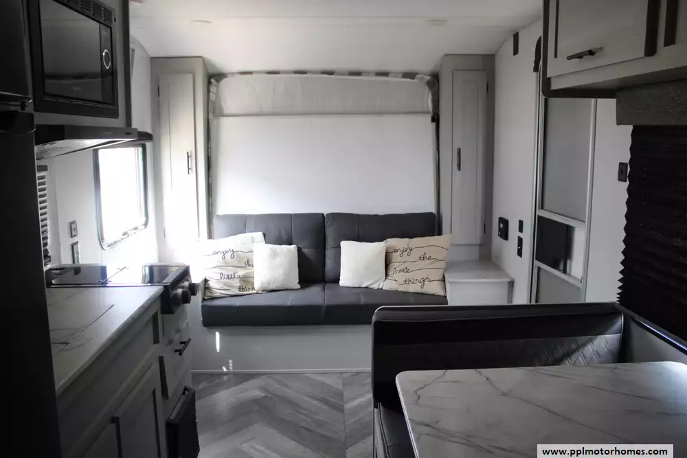 The interior offers modern residential touches such as panoramic windows, durable vinyl flooring, a fully equipped kitchen with a two-burner cooktop and microwave, and multiple USB charging ports, while the Platinum package enhances styling with upgraded finishes.