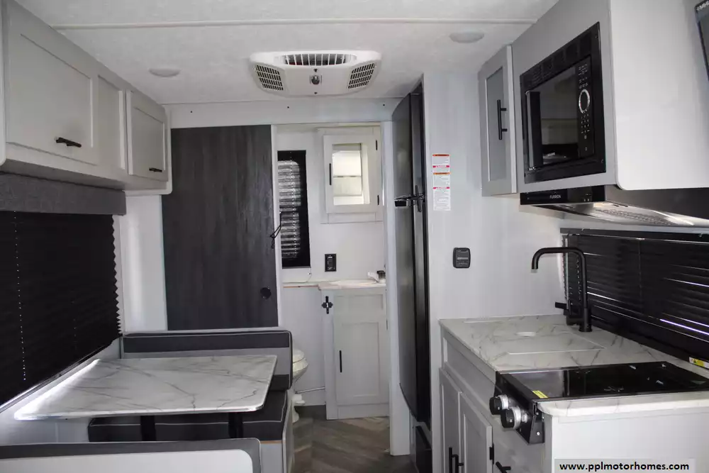 The 2022 Forest River Wildwood FSX Platinum 167RBKX is a lightweight, compact travel trailer designed for easy towing and efficient use of space, making it ideal for couples or small families seeking a comfortable camping experience. Measuring just over 21 feet in length and weighing around 3,000-3,400 pounds dry, it features a smart single-axle layout with a front queen bed that can convert into a daytime sofa, a booth dinette, and a spacious rear bathroom with a large shower and added storage.