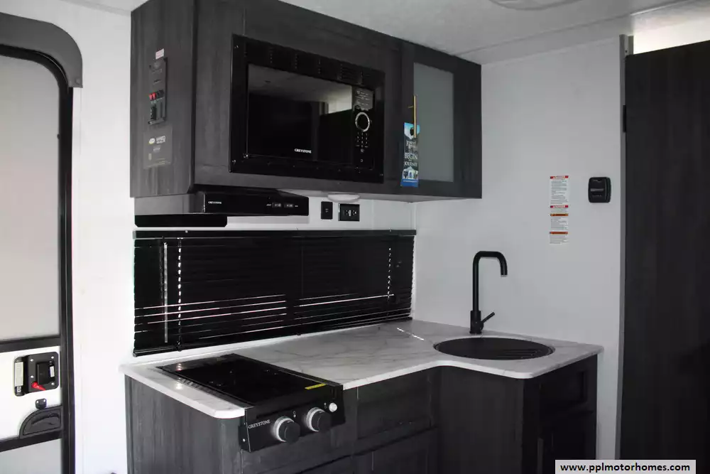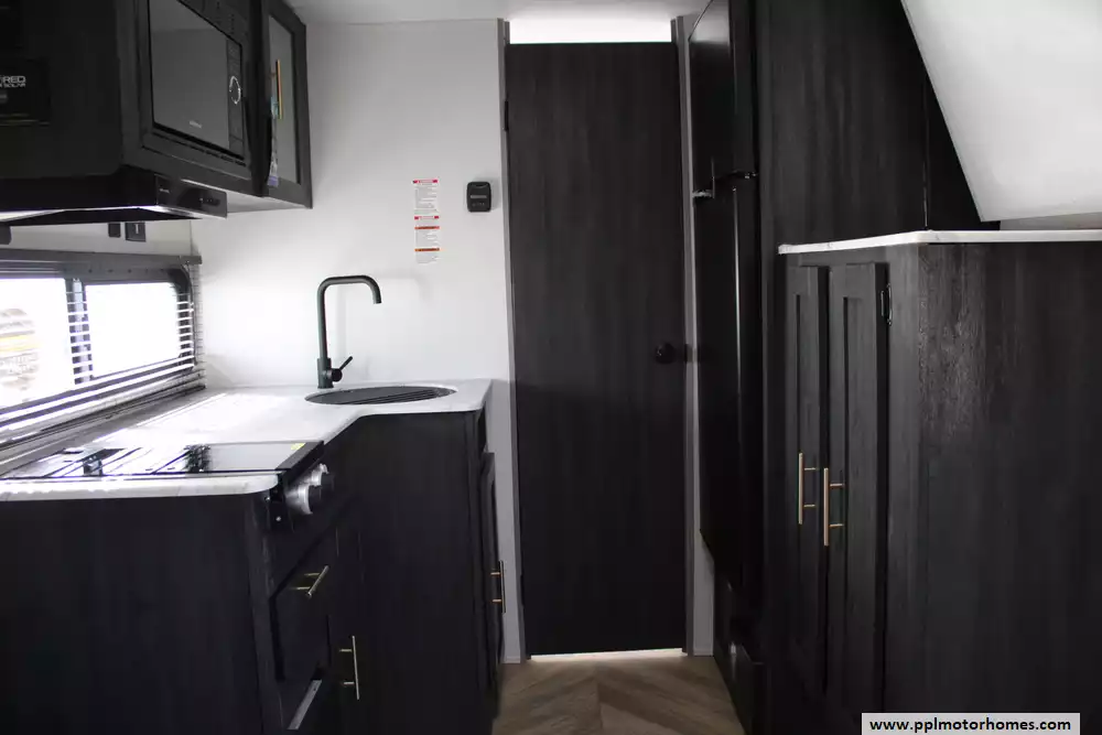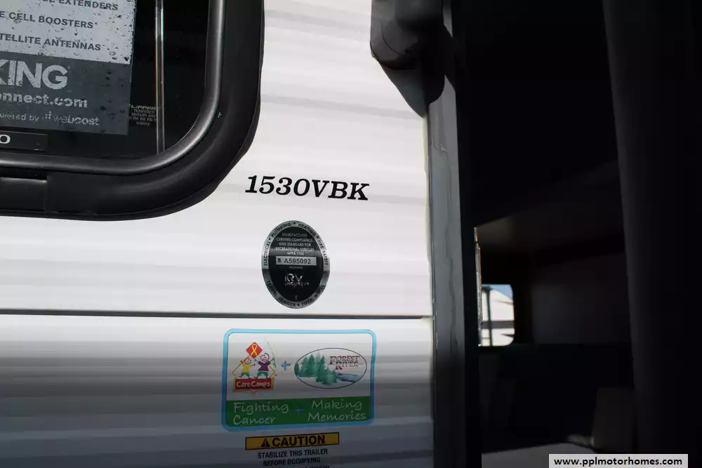 The 2022 Forest River Ozark Lite 1530VBK is a compact, lightweight single-axle travel trailer designed to comfortably sleep up to four people, featuring a front queen-size bed with a flip-down bunk above and a second flip-down bunk across from the galley for flexible sleeping arrangements. It includes a full rear bathroom with a 36" x 24" shower, a functional kitchen with an 11 cu ft double-door 12 V refrigerator, two-burner cooktop and microwave prep, and practical interior touches like carpet-free flooring and generous windows for natural light. Outside, a 10-ft power awning with adjustable legs and LED lighting extends your living space, there's a bike-sized cargo door with removable cargo net for gear storage, and a durable build geared toward ease of towing and camping convenience. With a GVWR around 3,500 lbs and a host of standard features that maximize comfort in a small footprint, the 1530VBK balances simplicity and functionality for weekend trips or extended adventures.