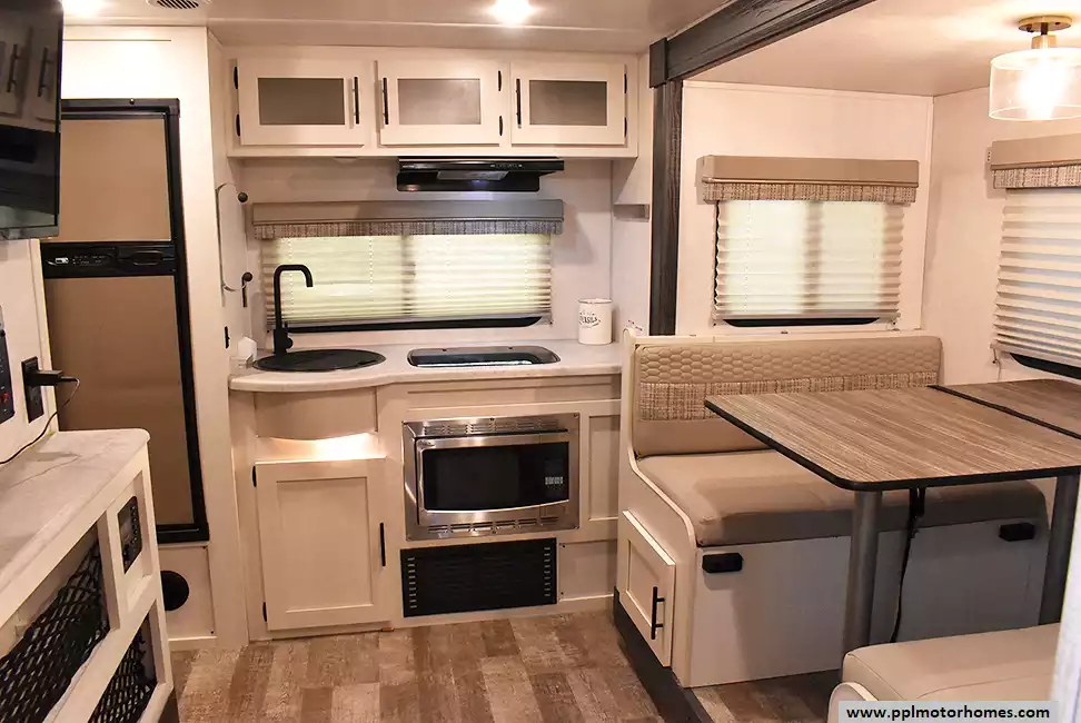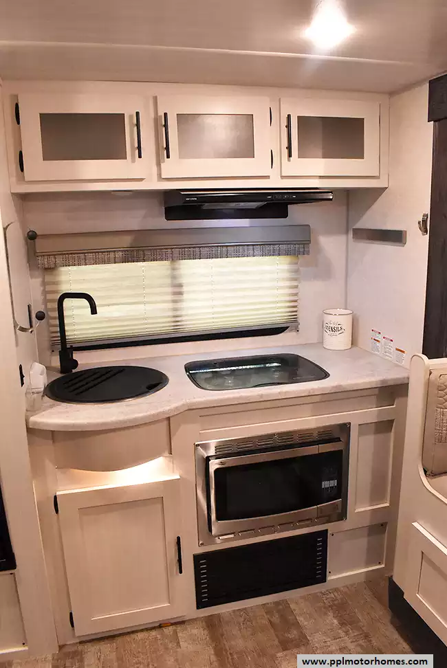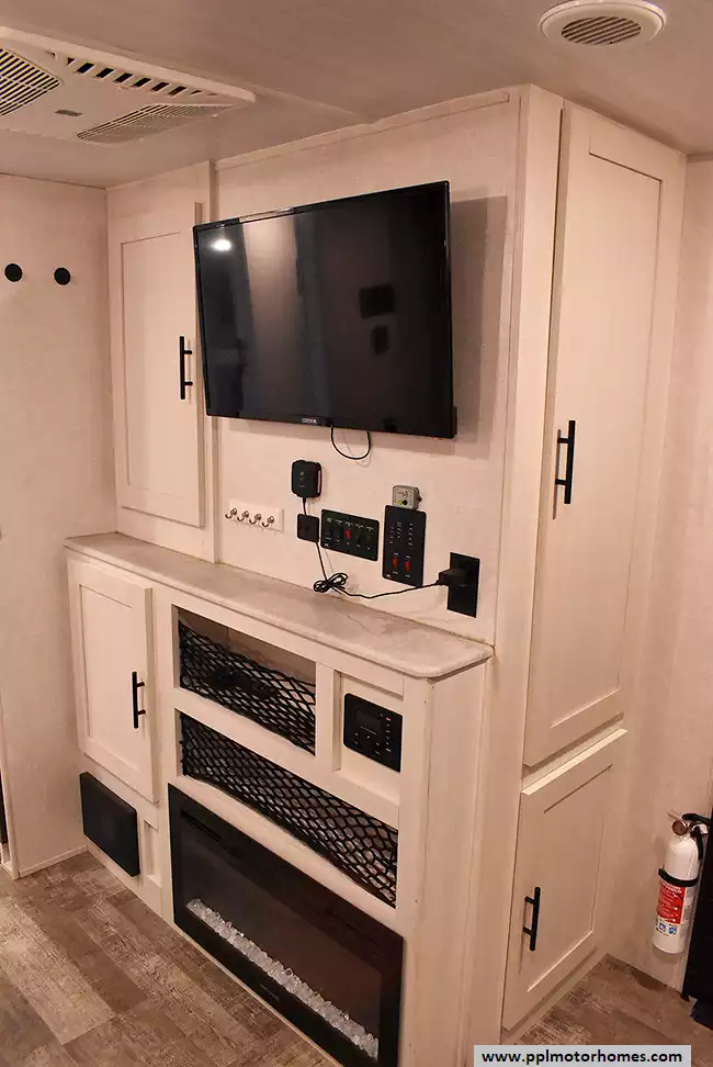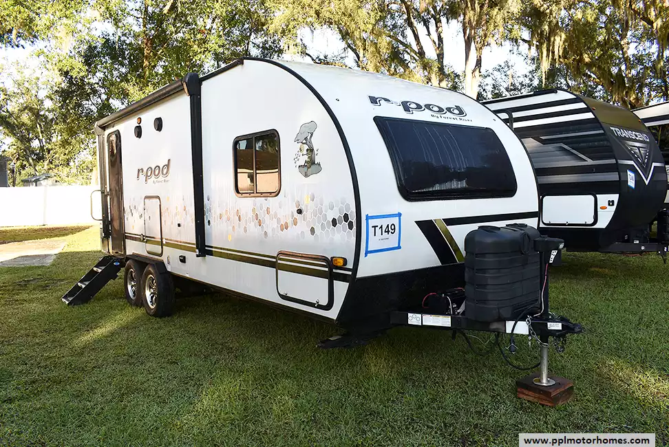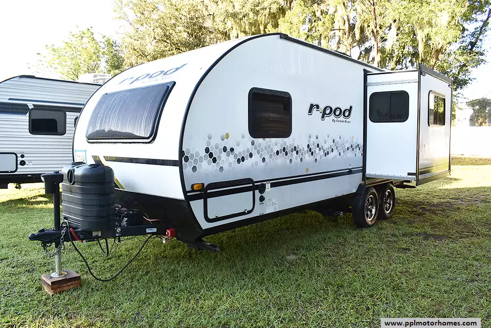 This 2022 R-Pod 202 has an Electric Tongue Jack, 1 Slide-out, 1 Ducted Air Conditioner, Double Door Gas/110v Norcold Refrigerator (Additional Refrigerator Present), Automatic Main Awning, Solar Panel, Outside Speakers, TV, Fireplace, Convection Microwave, 2 Burner Range, Oven
