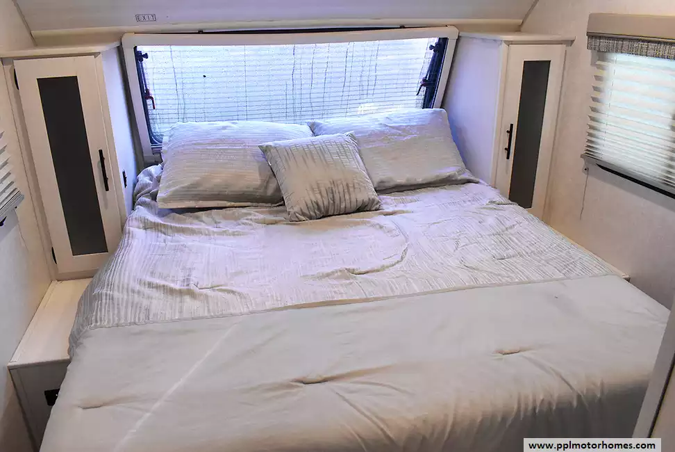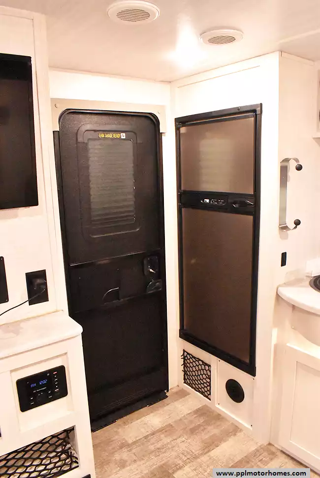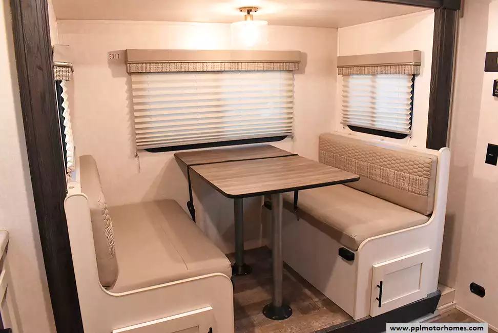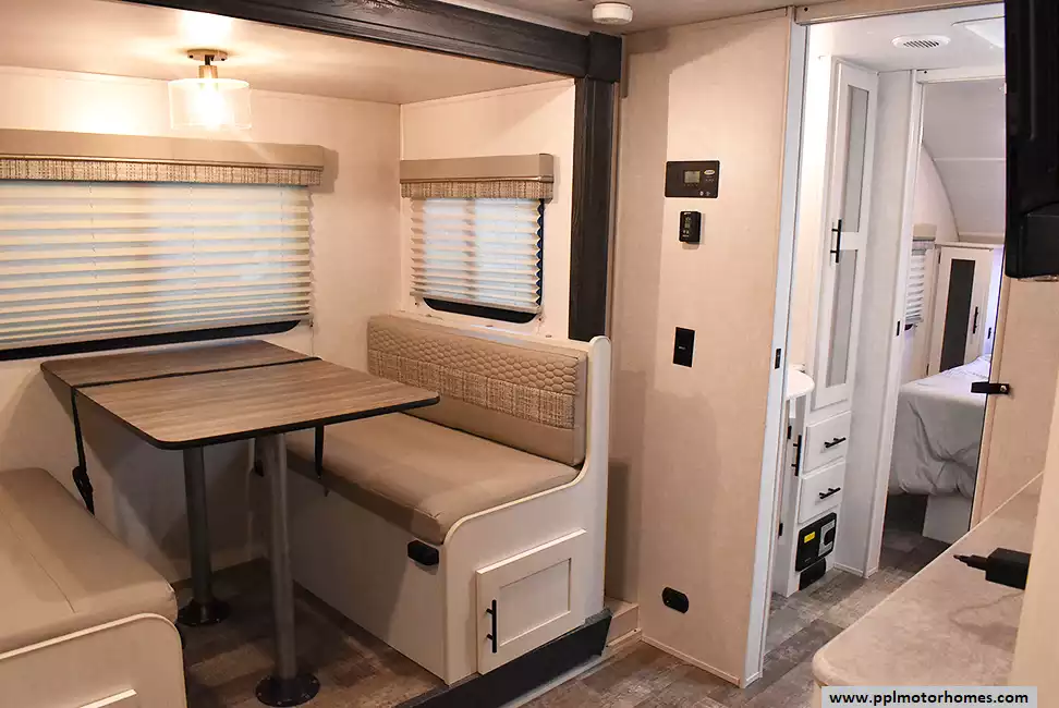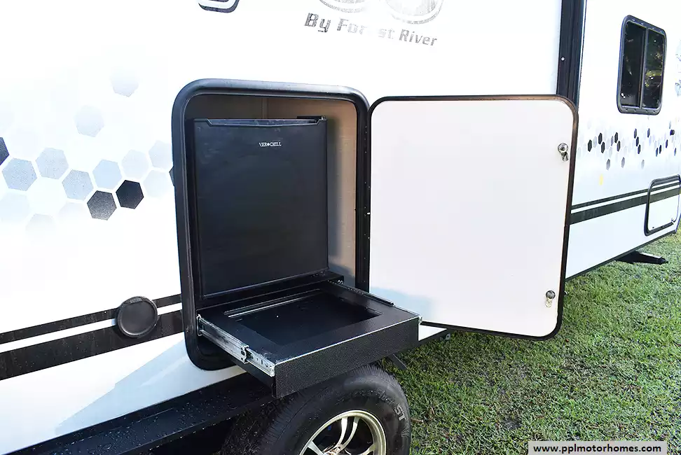 This 2022 R-Pod 202 has an Electric Tongue Jack, 1 Slide-out, 1 Ducted Air Conditioner, Double Door Gas/110v Norcold Refrigerator (Additional Refrigerator Present), Automatic Main Awning, Solar Panel, Outside Speakers, TV, Fireplace, Convection Microwave, 2 Burner Range, Oven