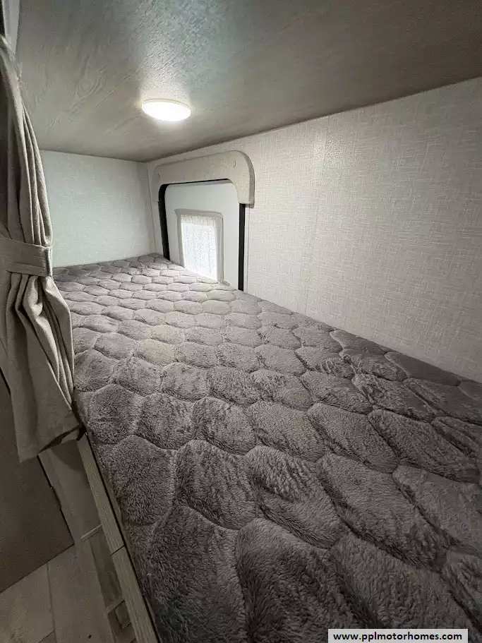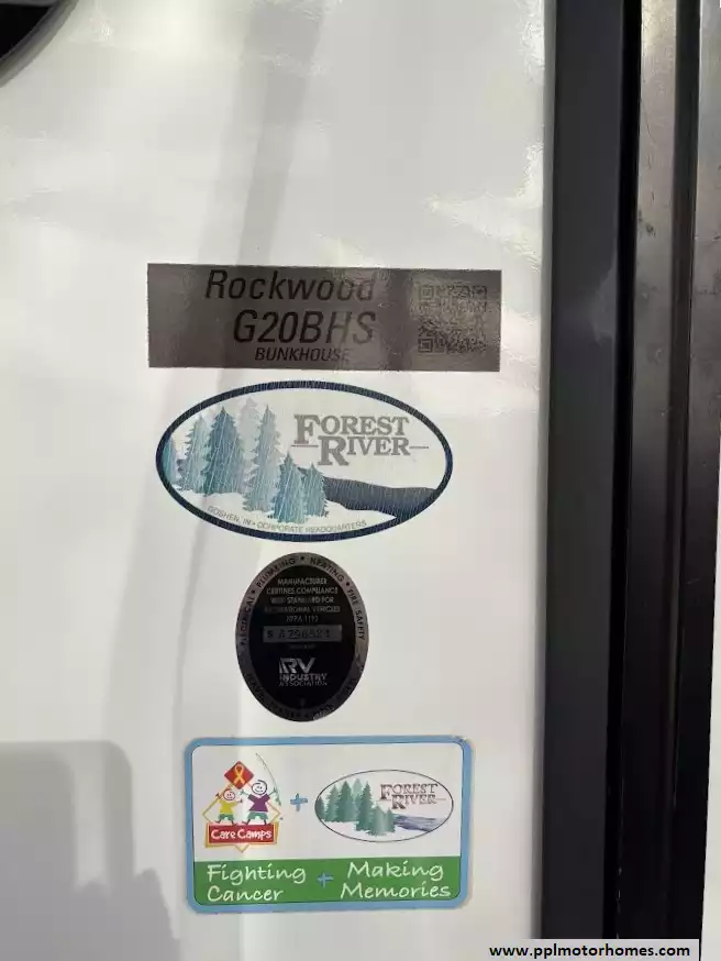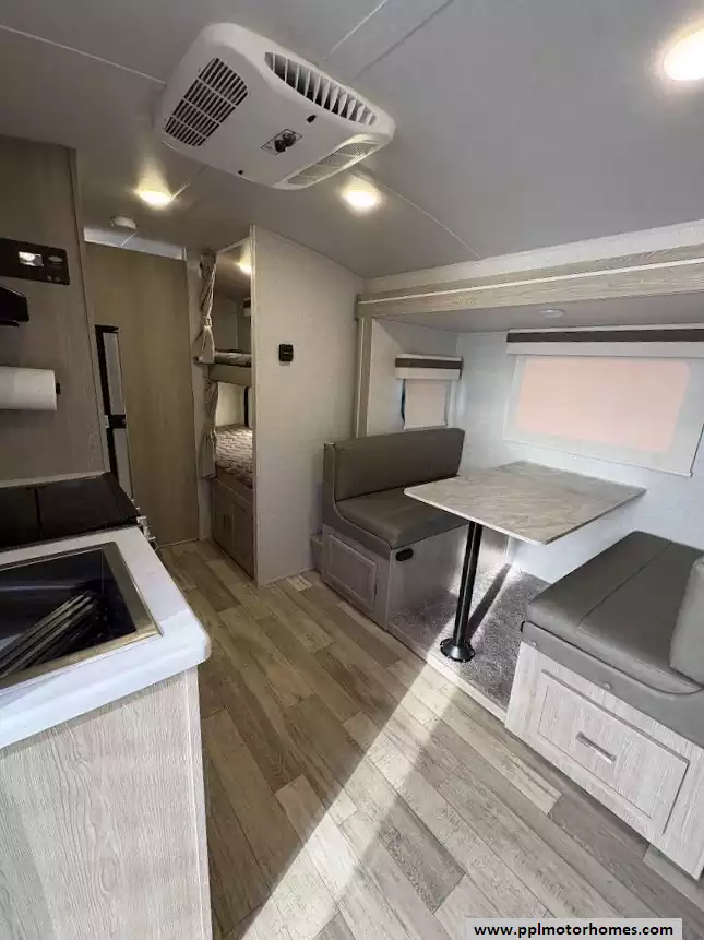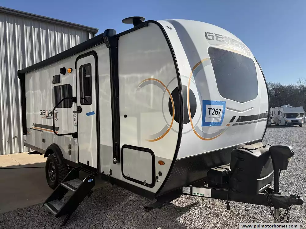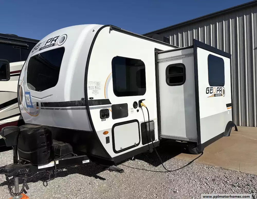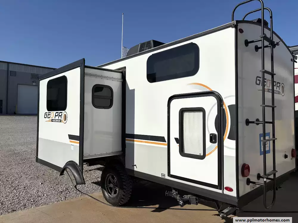 There is a queen size bed located in the front, twin over twin bunk beds in the rear and the dinette can convert to a sleeping space as well. This model comes equipped with a high-quality refrigerator to keep your supplies fresh on long hauls, ensuring you have all the comforts of home wherever the road leads. Combining modern convenience with the versatile, adventure-ready reputation the Rockwood brand is famous for, this Geo Pro 20BHS is the perfect balance of maneuverability and functional living space.