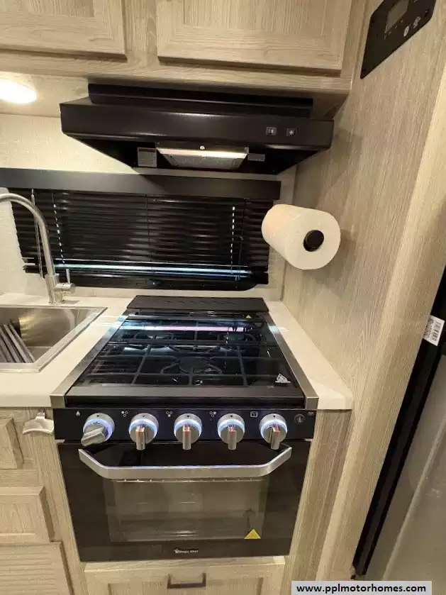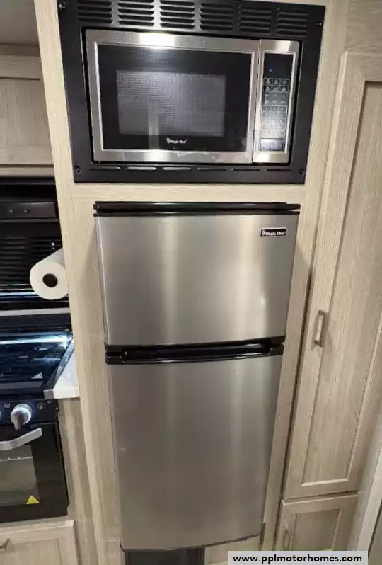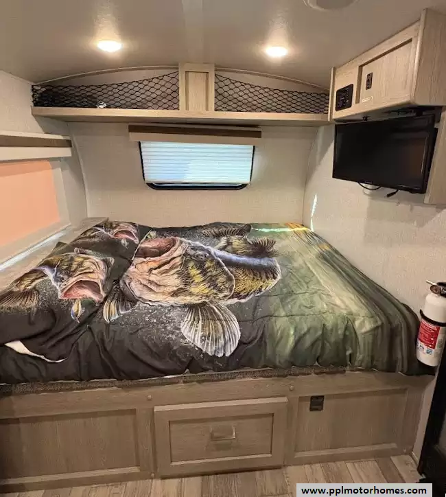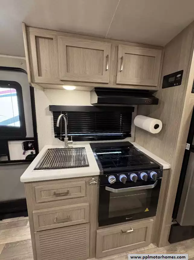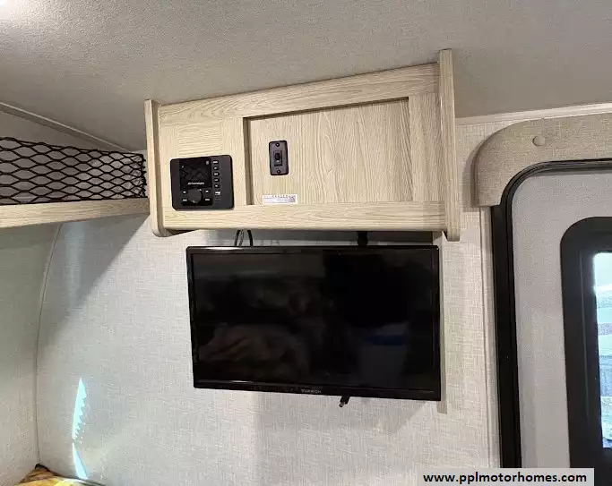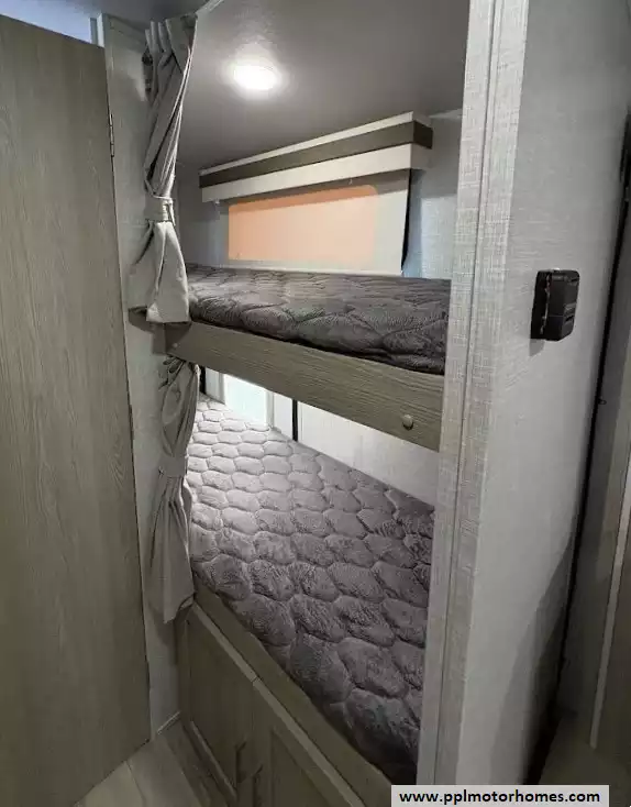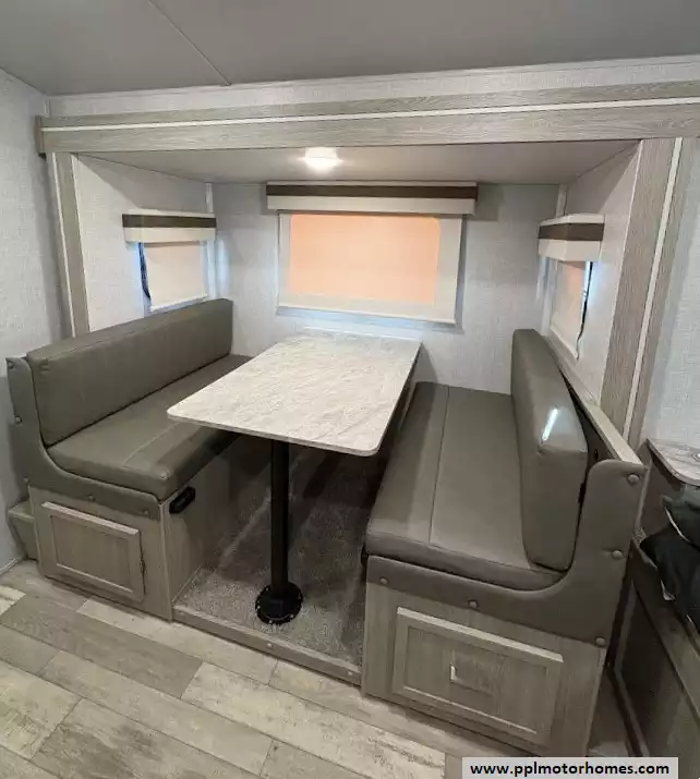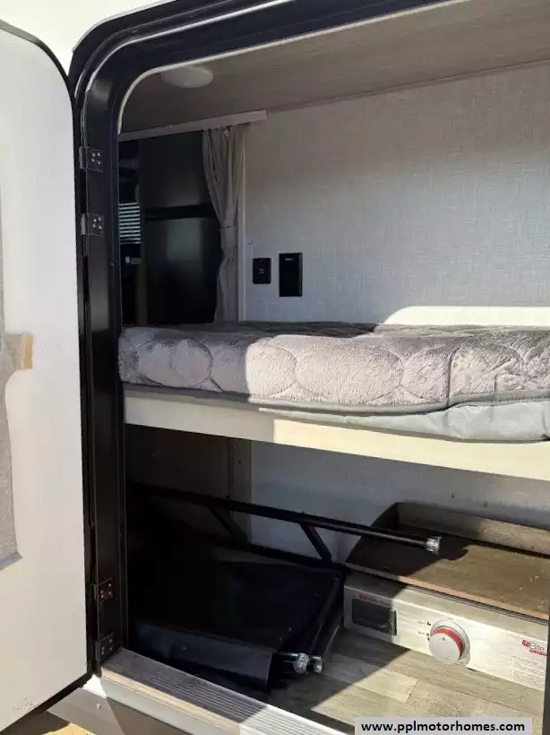 There is a queen size bed located in the front, twin over twin bunk beds in the rear and the dinette can convert to a sleeping space as well. This model comes equipped with a high-quality refrigerator to keep your supplies fresh on long hauls, ensuring you have all the comforts of home wherever the road leads. Combining modern convenience with the versatile, adventure-ready reputation the Rockwood brand is famous for, this Geo Pro 20BHS is the perfect balance of maneuverability and functional living space.
