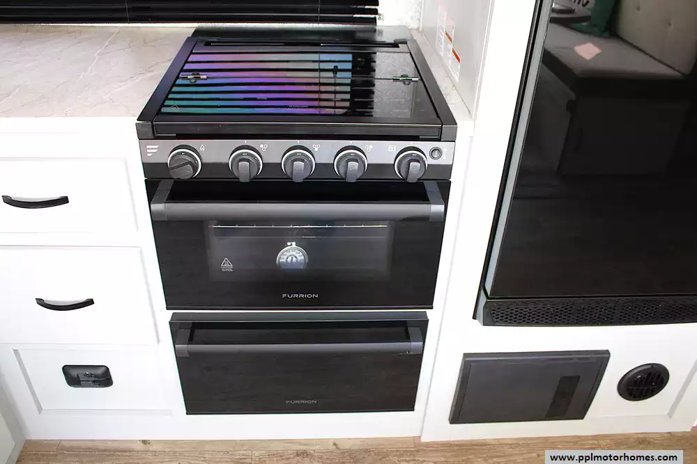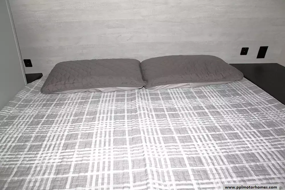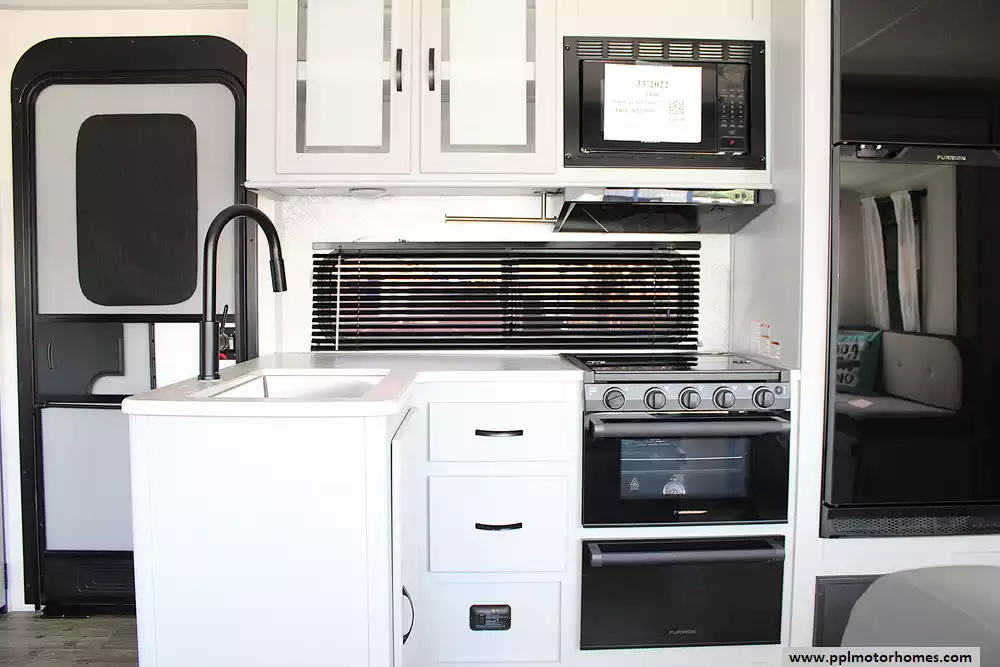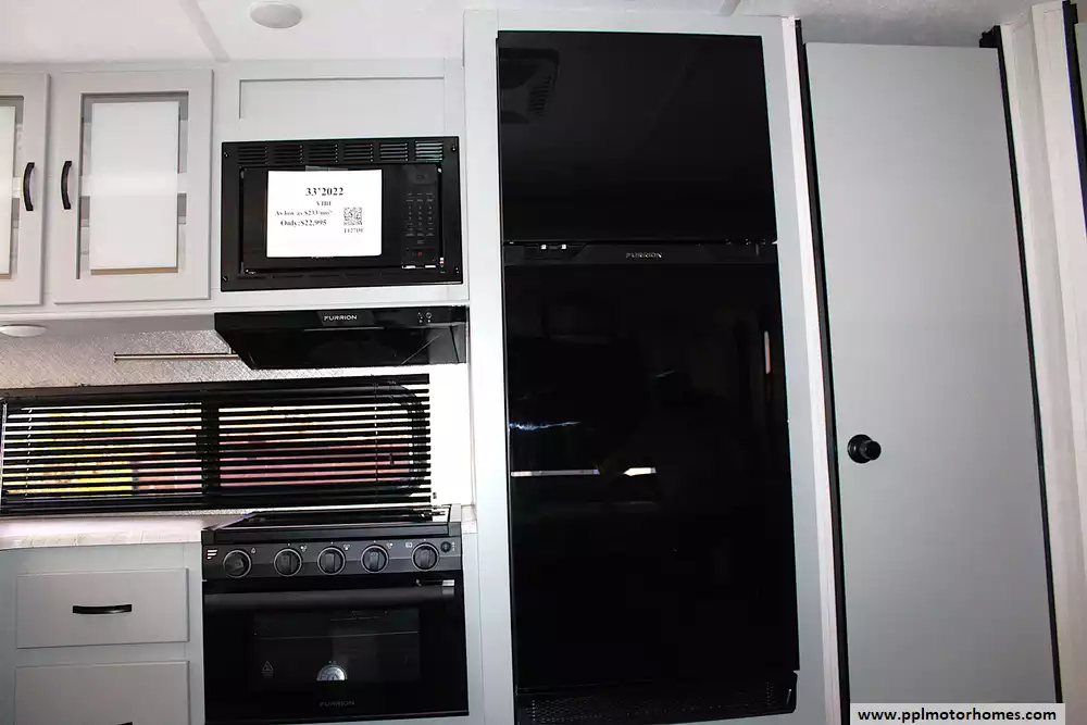 Inside, you'll find a spacious and functional floor plan featuring double-over-double rear bunks, a private front queen bedroom, and a convertible dinette and sofa for additional sleeping. The kitchen is fully equipped with solid surface countertops, a large refrigerator, microwave, oven, and plenty of storage, making meal prep on the road a breeze. Entertainment is covered with a large TV, Bluetooth stereo system, and indoor/outdoor speakers, while the electric fireplace adds a cozy touch for cooler nights.