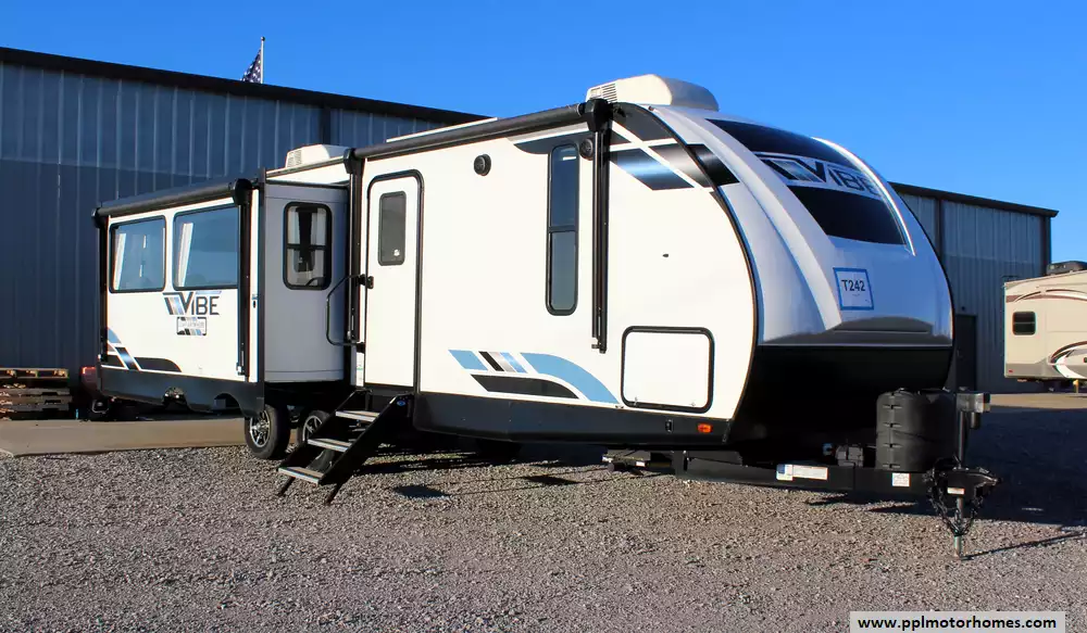 This 2022 Vibe 28RL has an Electric Tongue Jack, 2 Slide-outs, 1 Non-Ducted And 1 Ducted Air Conditioner, Double Door 110v Furrion Refrigerator, Automatic Main Awning, Solar Panel, Heated Tanks, Outside Speakers, 2 TVs, Outside Shower, Fireplace, Microwave, 3 Burner Range, Oven