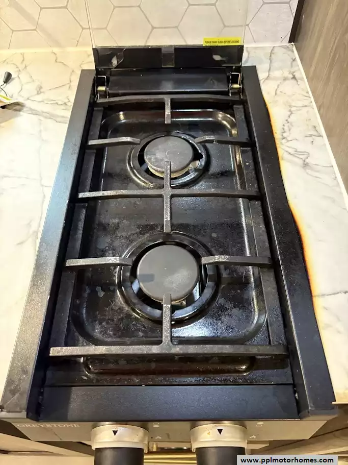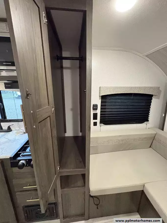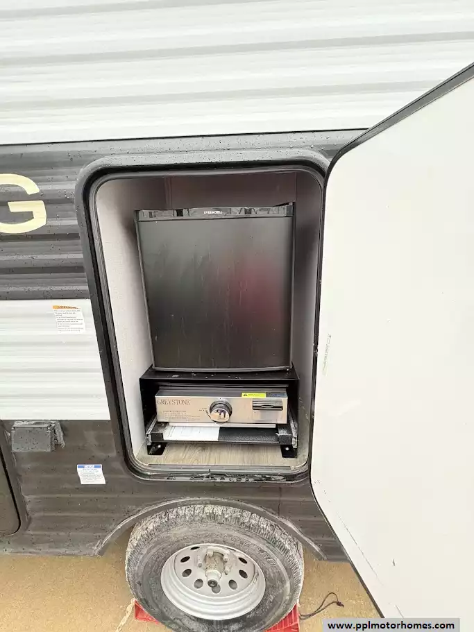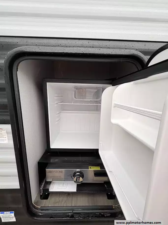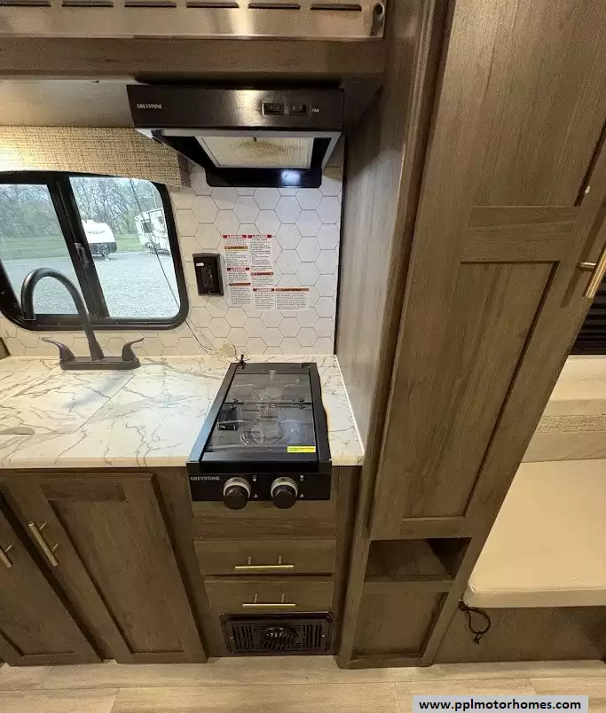 Inside, you will find a fully equipped kitchen featuring a double-door Everchill refrigerator, a microwave, and a 2-burner range for all your meal prep needs. The interior stays perfectly chilled with a non-ducted air conditioner, while the durable TPO roof provides long-lasting protection against the elements. Transition to the outdoors with ease thanks to the automatic main awning and additional window and door awnings that provide ample shade. Whether you are rinsing off at the outside shower, listening to your favorite music through the outside speakers, or cooking a meal on the outdoor grill, this Viking is ready to elevate your next Great Outdoors getaway.