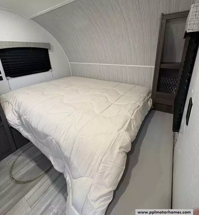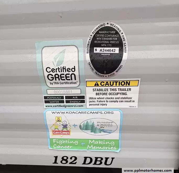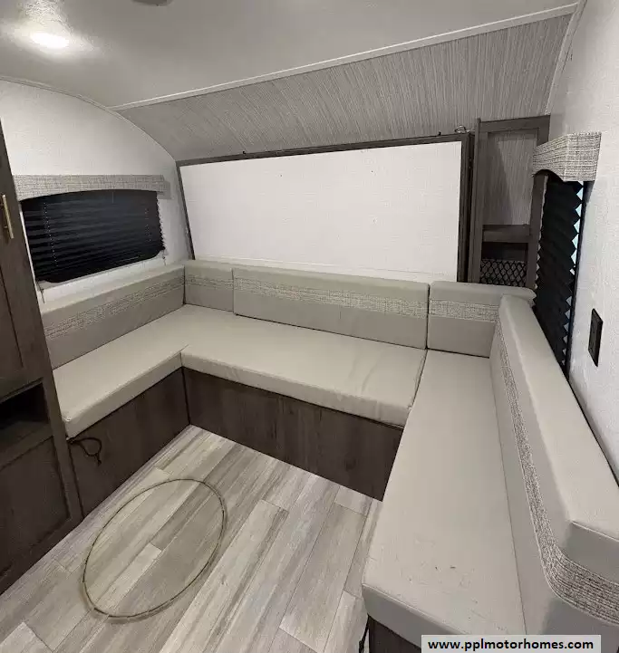 The 2022 Coachmen Viking 182DBU is designed to sleep 4 to 6 people depending on child vs adult. It utilizes a versatile bunkhouse floorplan that includes a front Murphy bed, rear double bunks, and a convertible dinette.