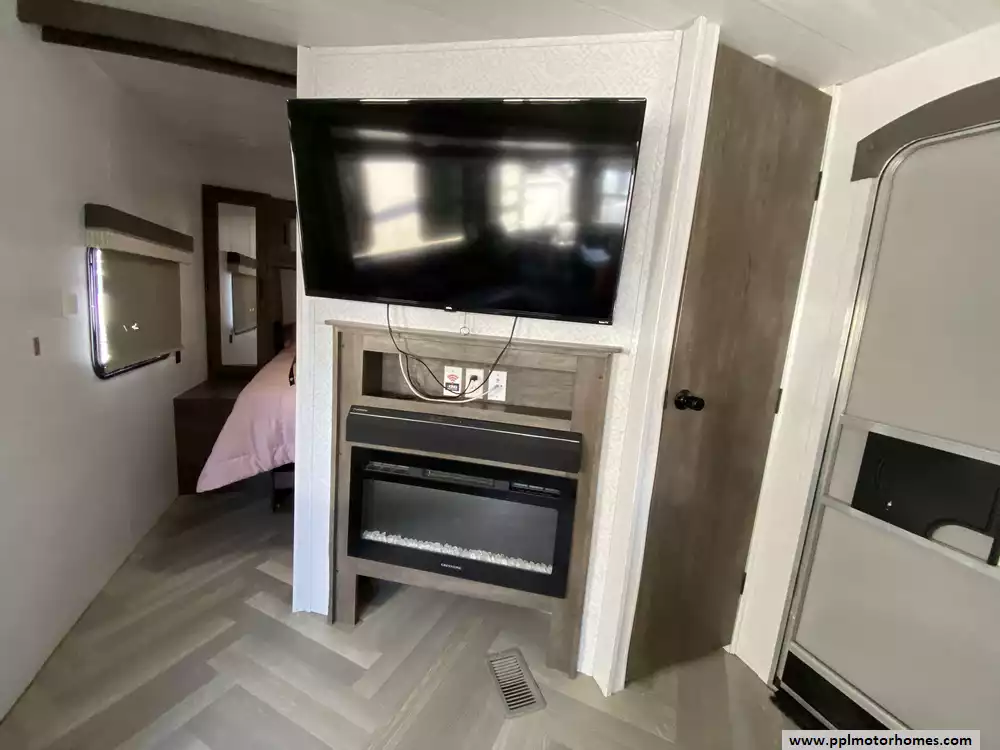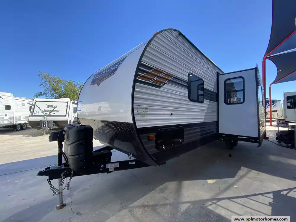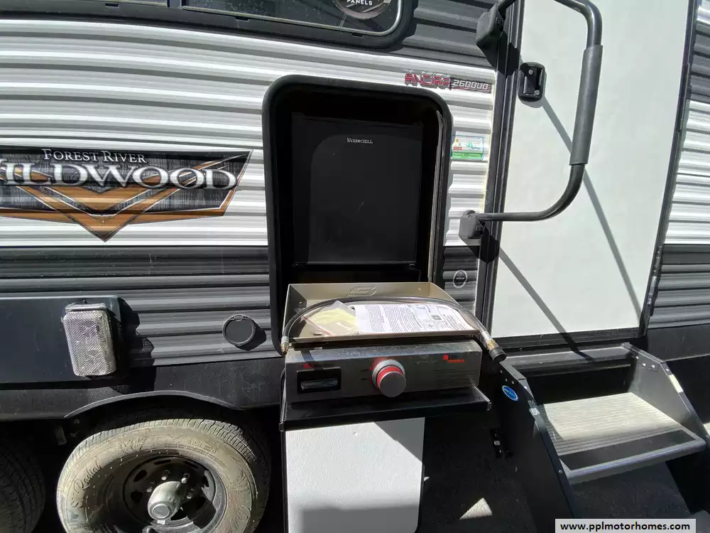 This 2022 Wildwood by Forest River 26DBUD has an Electric Tongue Jack, 1 Slide-out, 1 Ducted Air Conditioner, Double Door 110v Everchill Refrigerator, Automatic Main Awning, Outside Speakers, TV, Outdoor Grill, Outdoor Kitchen, Microwave, 3 Burner Range, Oven. Has new TV and New A/C