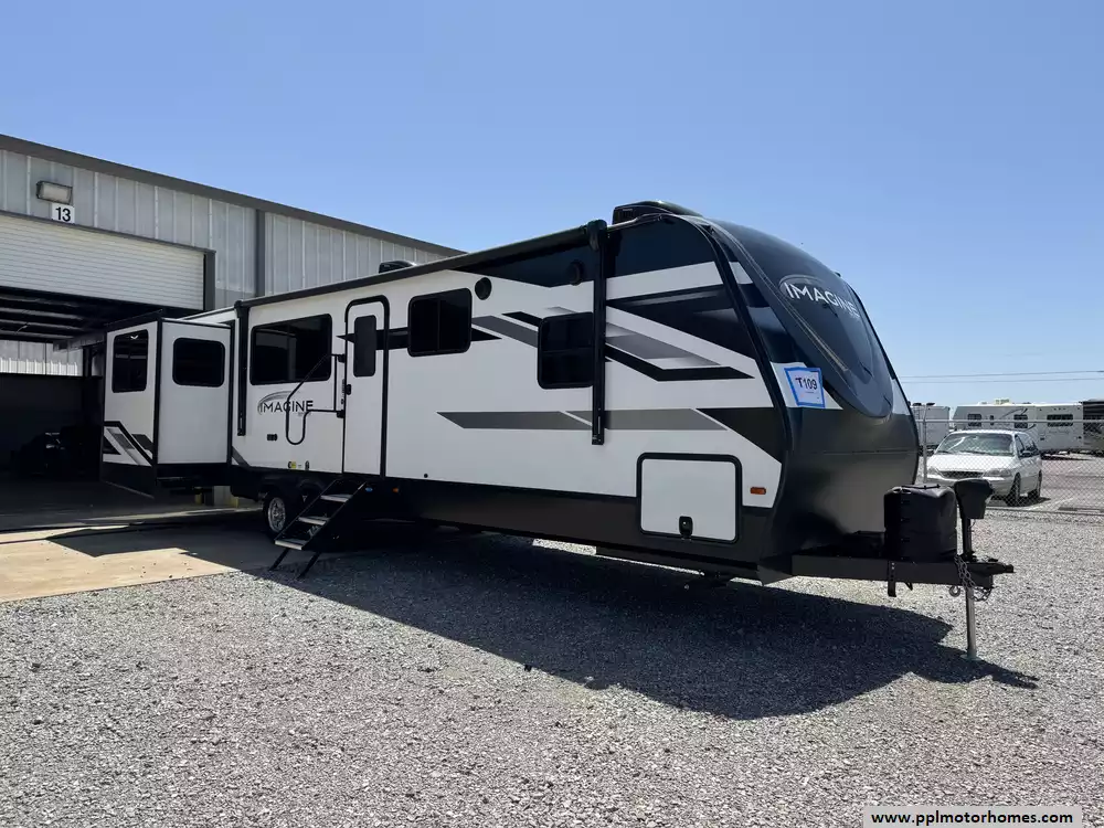 This 2022 Imagine 3100RD has an Electric Tongue Jack, 2 Slide-outs, 2 Ducted Air Conditioners, 12v Furrion Refrigerator, Automatic Main Awning And Window/Door Awnings, Solar Panel, Outside Speakers, TV, Outside Shower, Fireplace, Microwave, 3 Burner Range, Oven, sleeps ups to 6 with 1 Queen bed and 2 Sofa/Convertible beds.