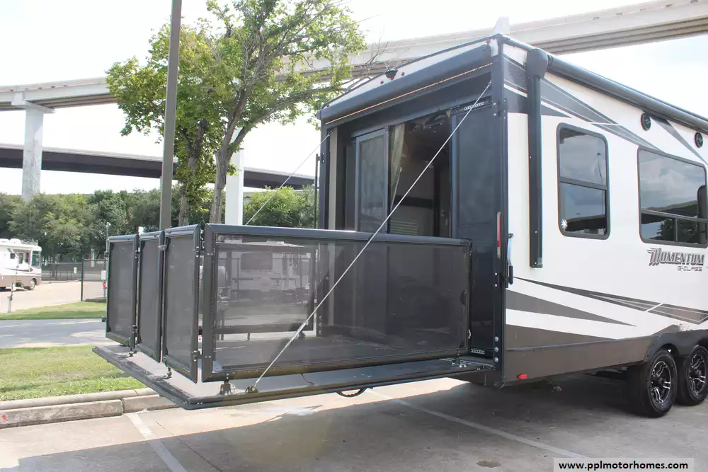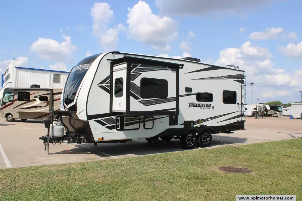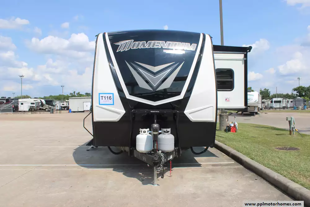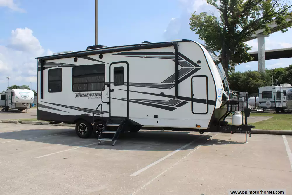 This 2022 Momentum 21G blends a compact footprint with full-featured luxury and garage-ready towing capability. Features Include...Electric Tongue Jack, 1 Slide-out, 1 Ducted Air Conditioner, Double Door Gas/110v Dometic Refrigerator, Automatic Main Awning And Slide Awning, TV, Microwave, 3 Burner Range, and Oven.