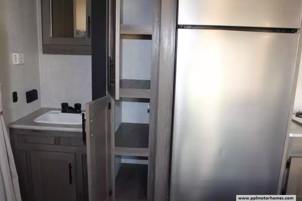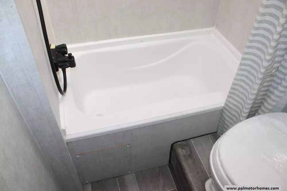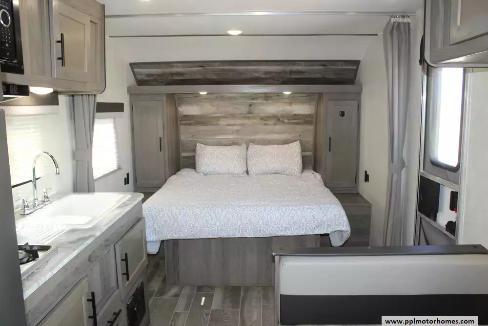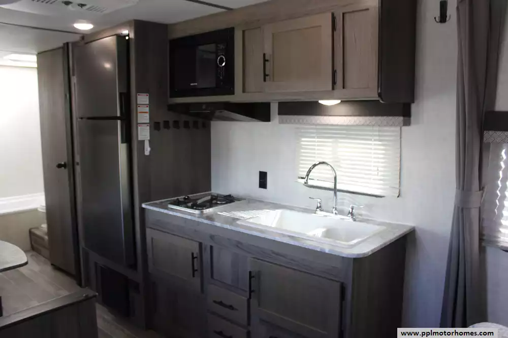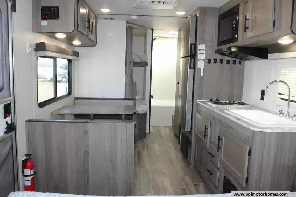 Specs: Length: 26.7 ft., Width: 8 ft., Height: 10.4 ft., Interior Height: 6.8 ft., Payload Capacity: 3,601 lbs., Total Fresh Water Tank Capacity: 23 gal., Total Gray Water Tank Capacity: 36 gal., Total Black Water Tank Capacity: 36 gal., Total Propane Tanks: 2, Total Propane Tank Capacity: 40 lbs.