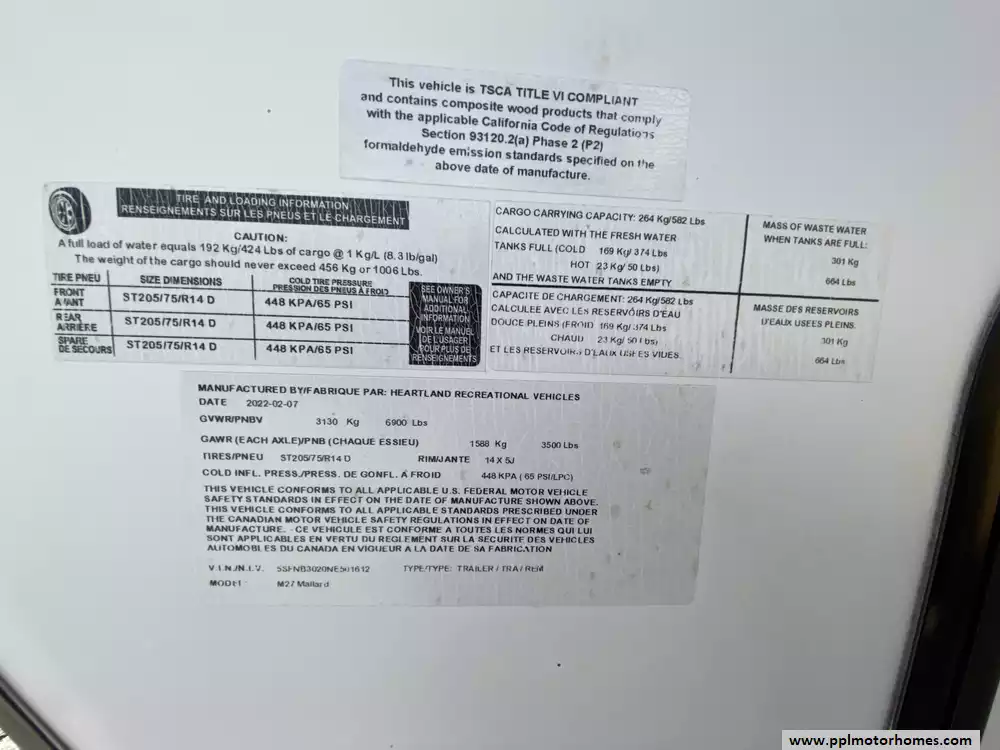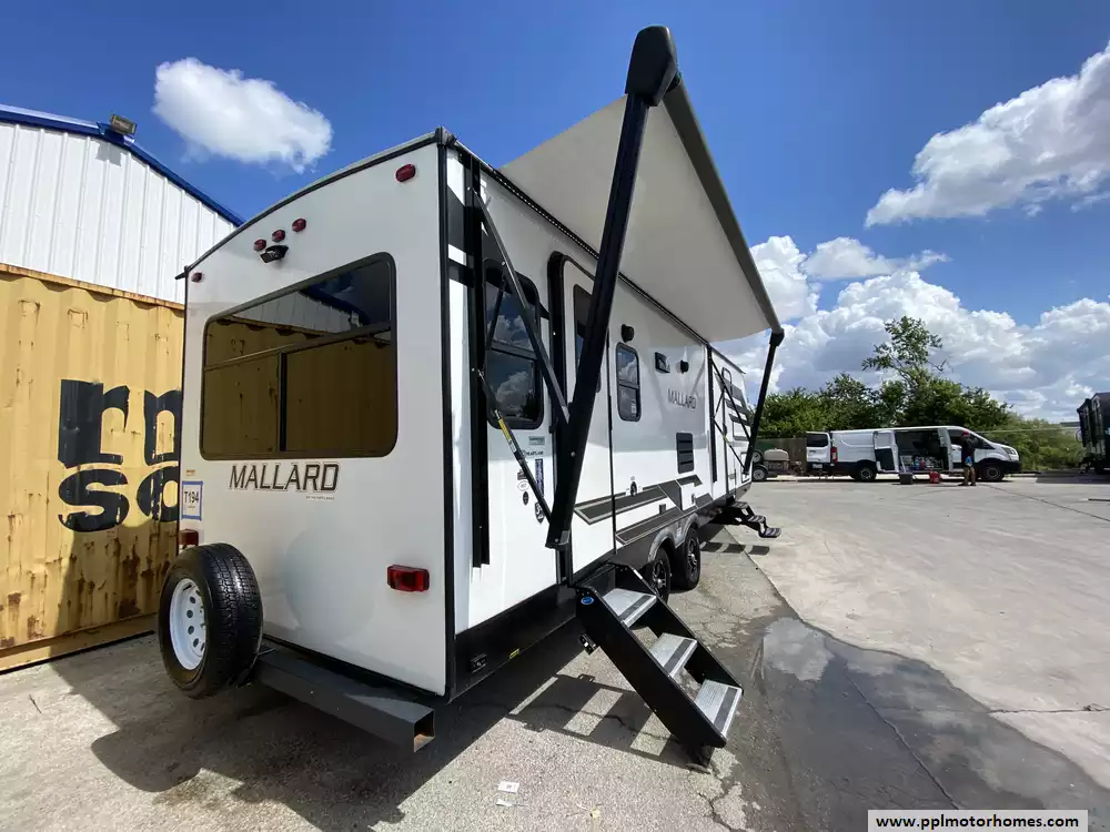 This 2022 Mallard by Heartland M 27 has an Electric Tongue Jack, 1 Slide-out, 1 Ducted Air Conditioner, Double Door Gas/110v Dometic Refrigerator, Automatic Main Awning, Outside Stereo, TV, Outside Shower, Microwave, 3 Burner Range, Oven