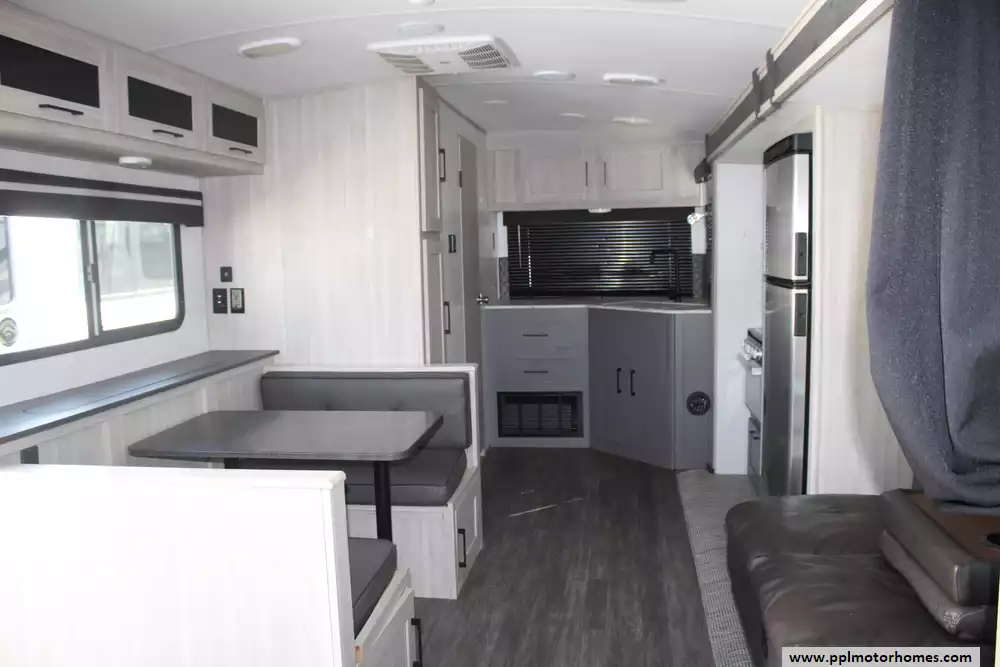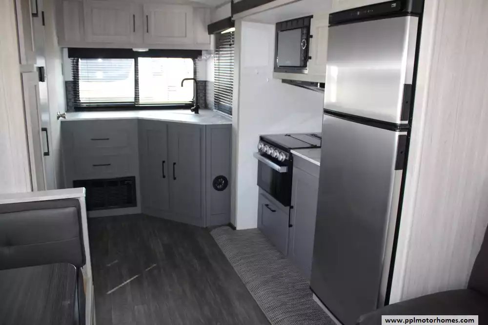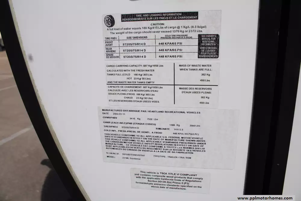 The 2022 Heartland Sundance Ultra Lite 231ML is a lightweight travel trailer designed for comfort, efficiency, and easy towing, measuring just under 27 feet in length with a dry weight of around 5,090 pounds. Built with aluminum framing and fiberglass sidewalls, it features a single slide-out that expands a mid-living floorplan with a sofa and booth dinette, while the front private bedroom includes a queen-size bed and the rear houses a full bathroom. The unit can sleep up to six people and offers practical amenities such as a full kitchen with three-burner stove, microwave, and full-size refrigerator, along with a 44-gallon fresh water tank and dual propane tanks for extended trips.