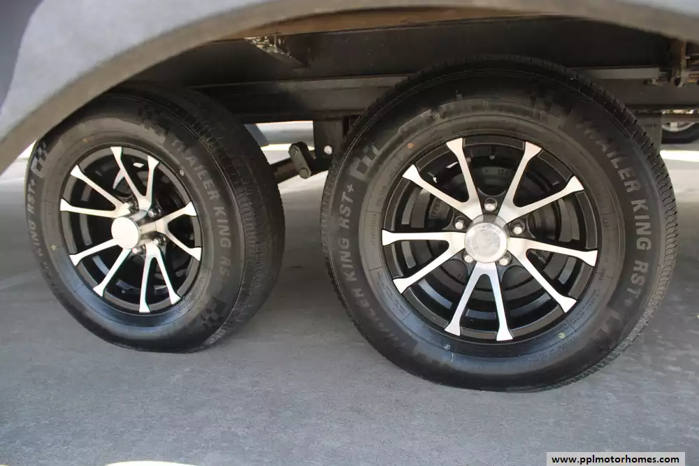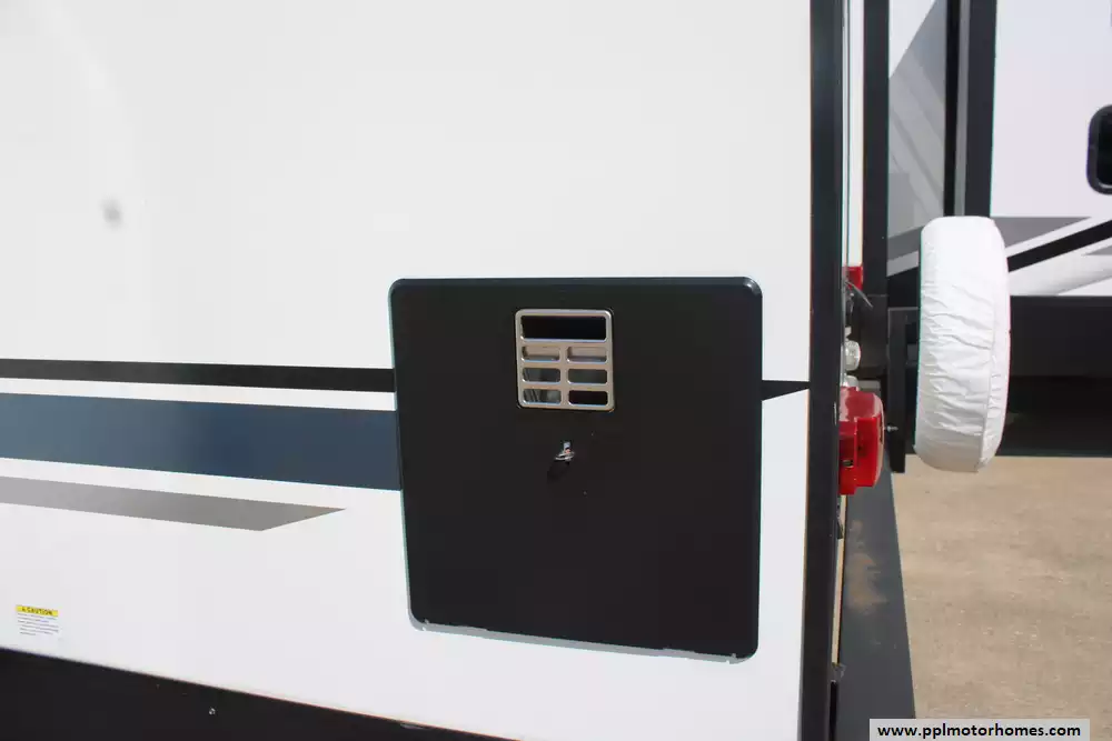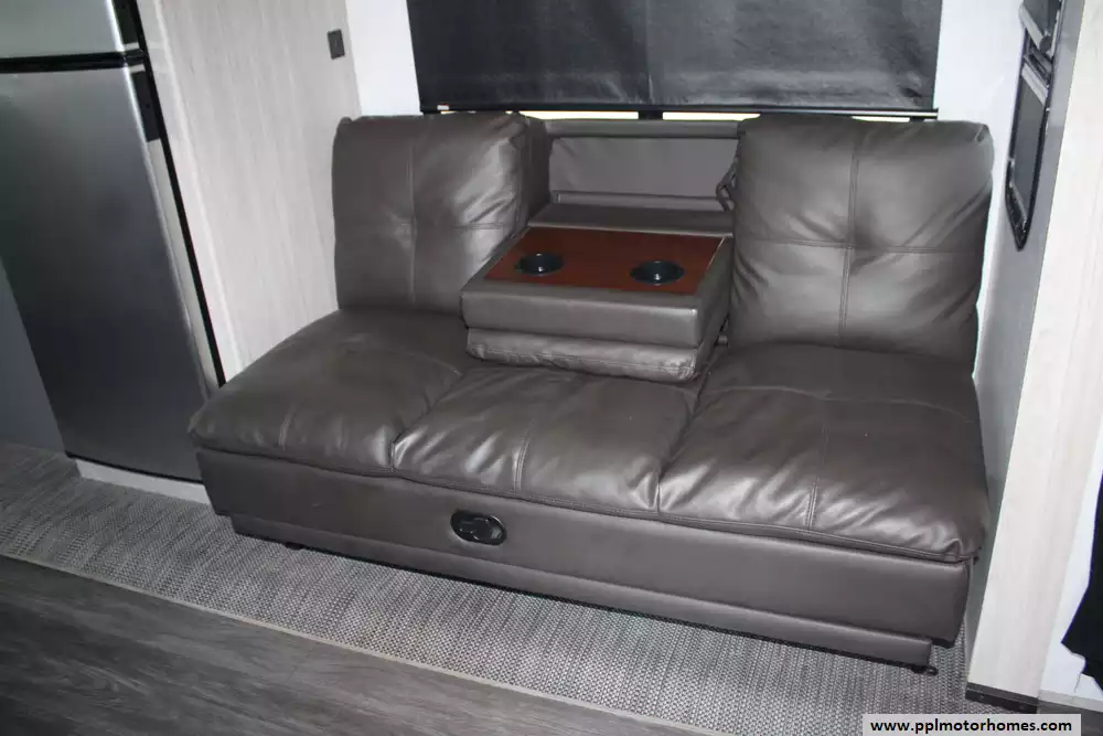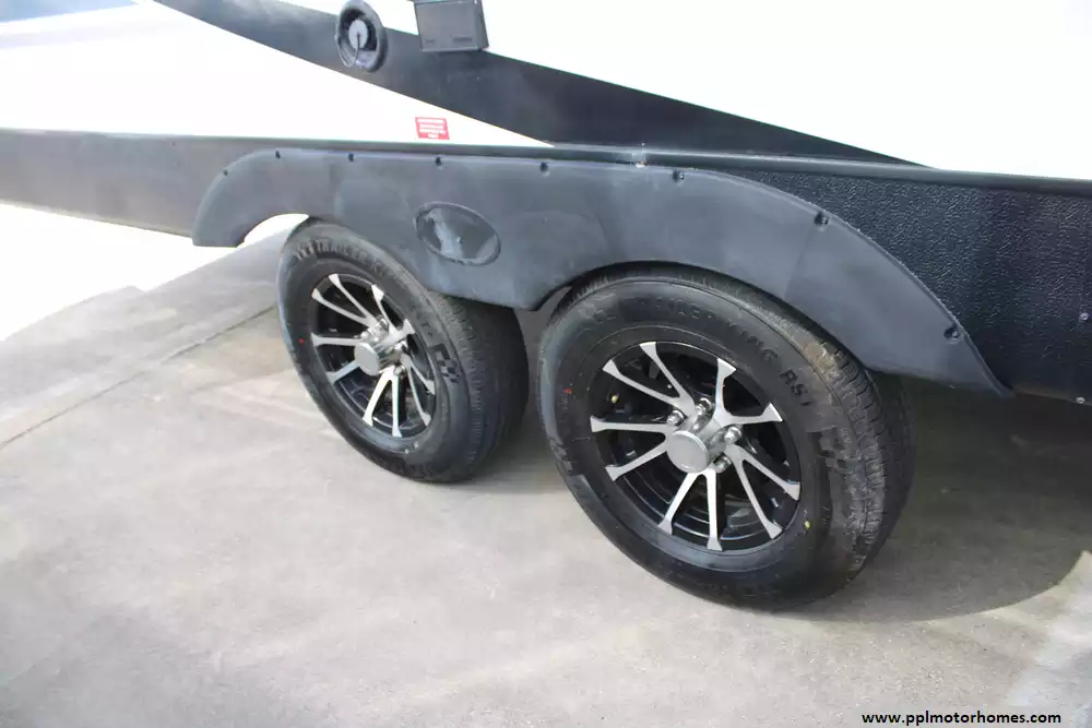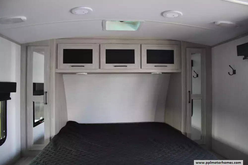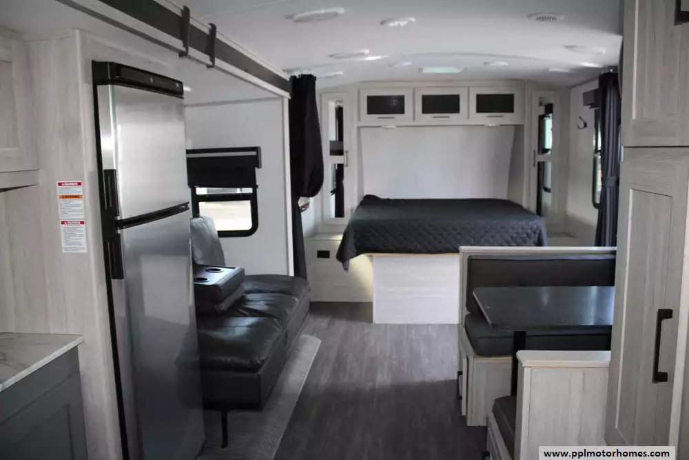 Additional highlights include a power awning, rear camera prep, pass-through storage, modern interior finishes, and climate control systems, making it a well-rounded option for couples or small families seeking a balance of livability and towability.