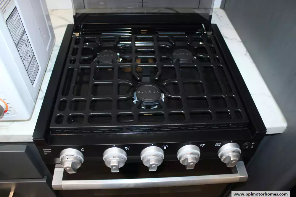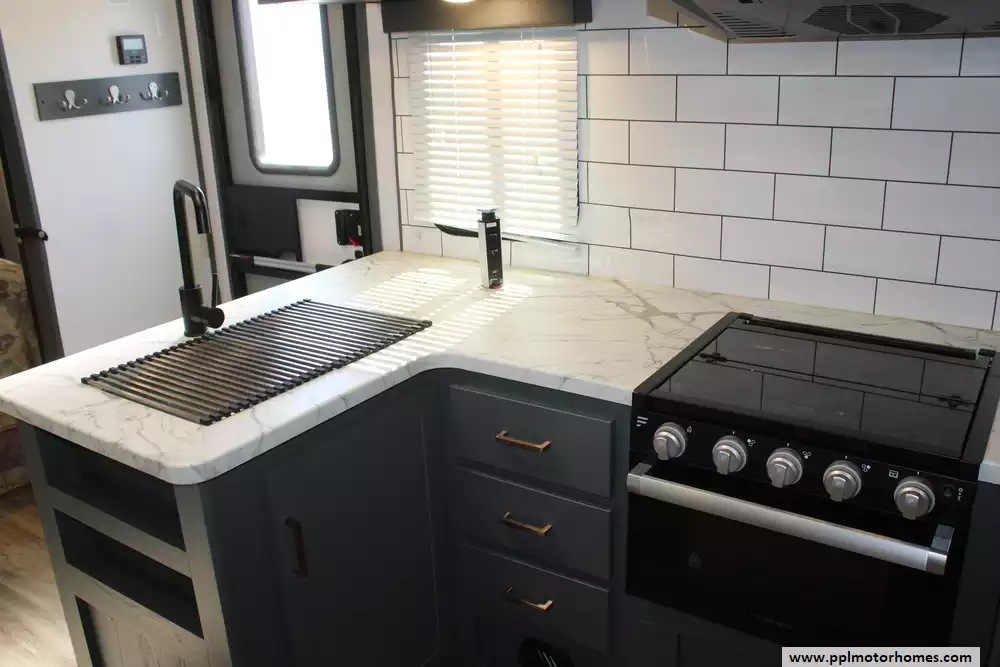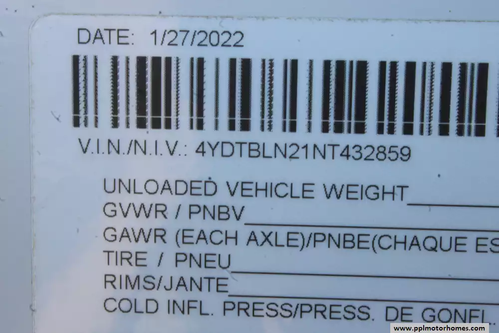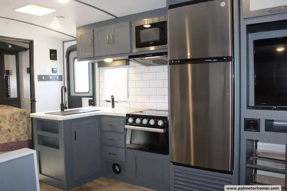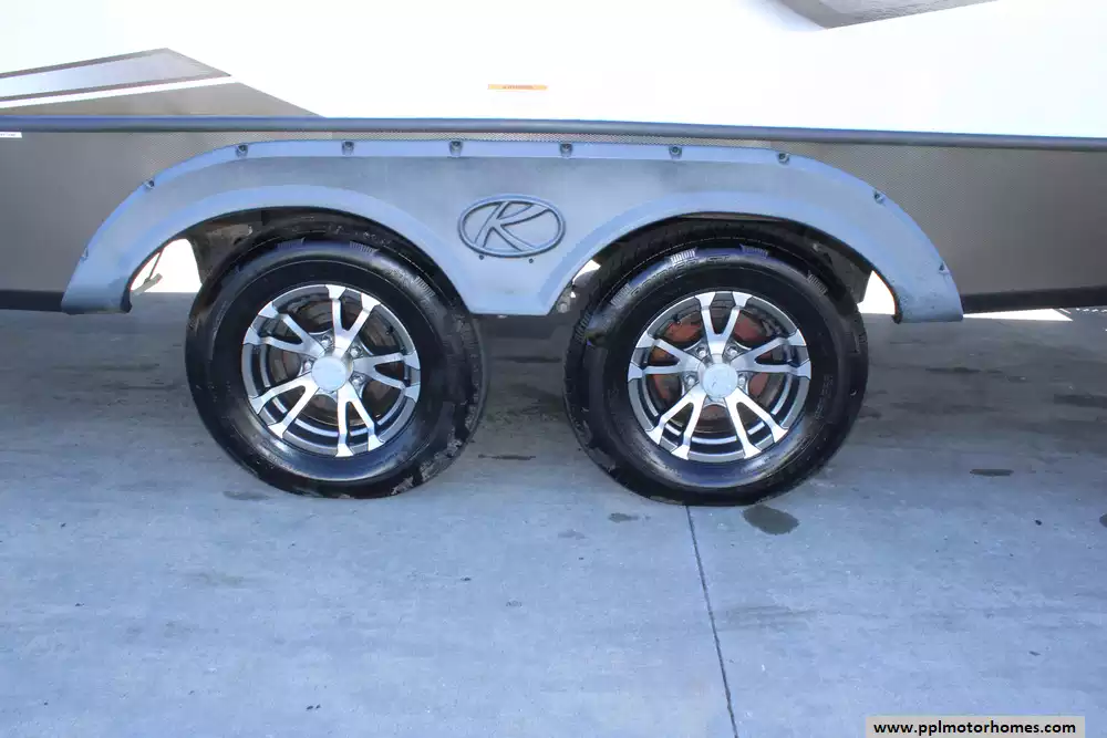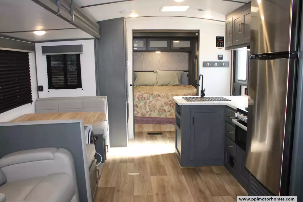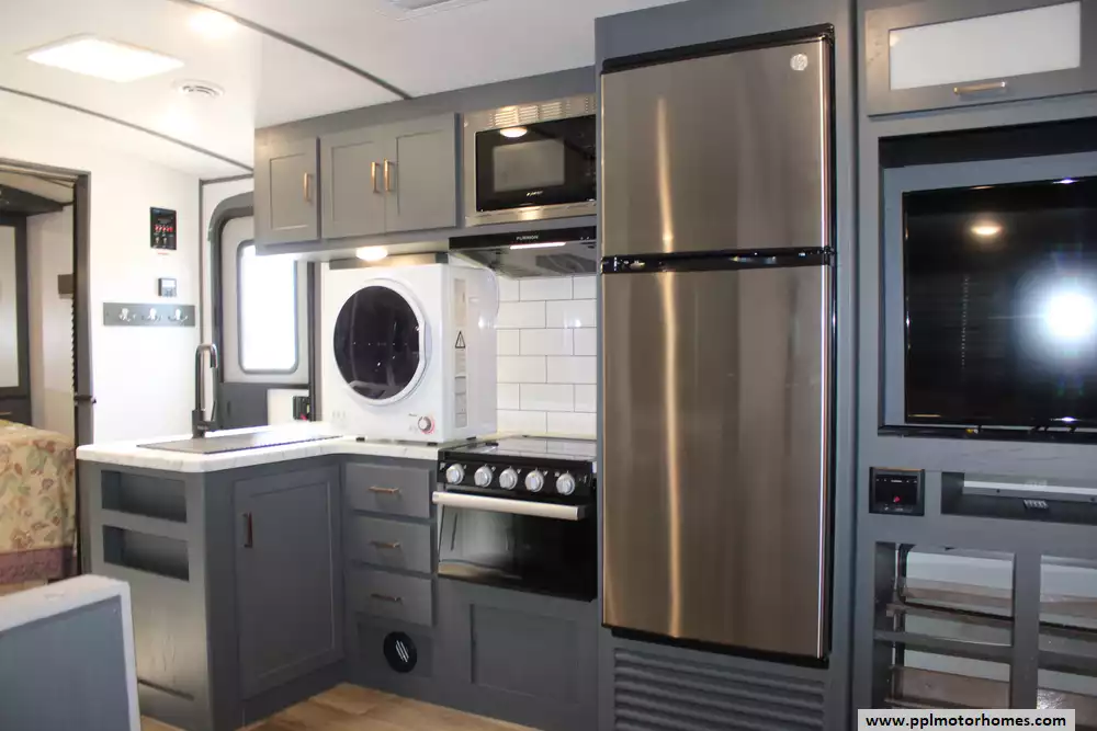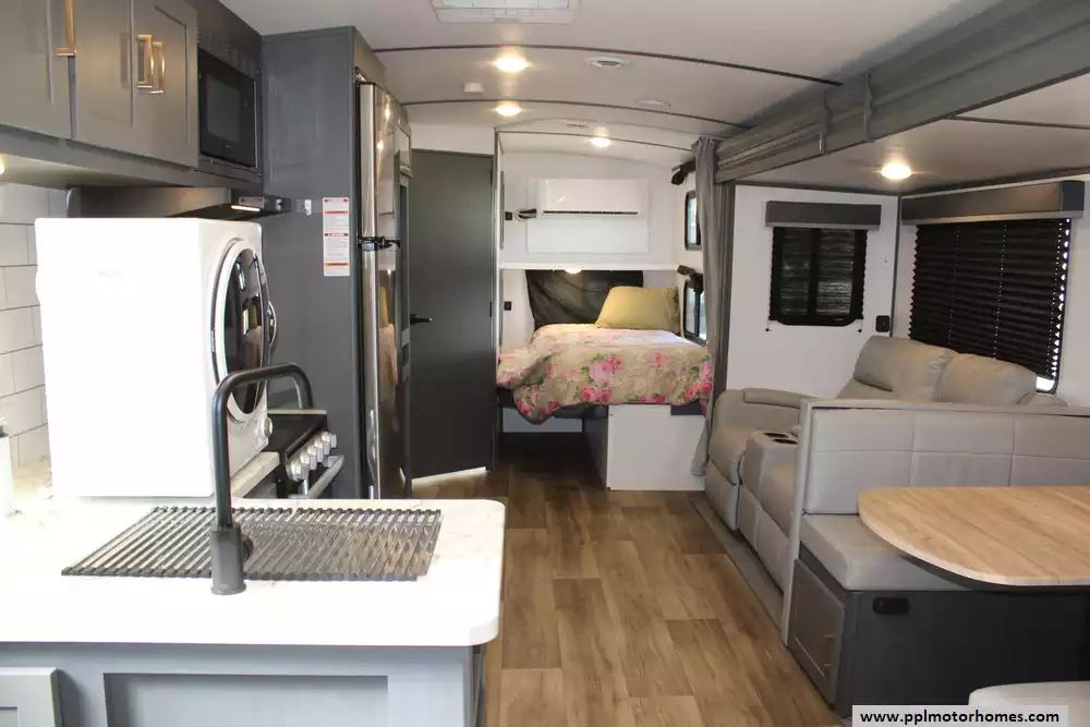 Specs: Length: 33.6 ft., Width: 8 ft., Height: 10.8 ft., Payload Capacity: 1,411 lbs., Total Fresh Water Tank Capacity: 43 gal., Total Gray Water Tank Capacity: 60 gal., Total Black Water Tank Capacity: 30 gal.