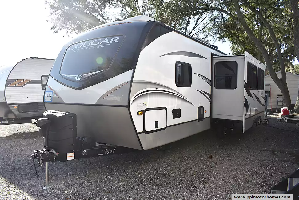 This 2022 Cougar by Keystone 29BHS has an Electric Tongue Jack, 1 Slide-out, 2 Ducted Air Conditioners, Double Door Gas/12v Norcold Refrigerator, Automatic Main Awning, Solar Panel, Outside Speakers, TV, DVD Player, Outdoor Grill, Outside Shower, Fireplace, Microwave, 3 Burner Range, Oven