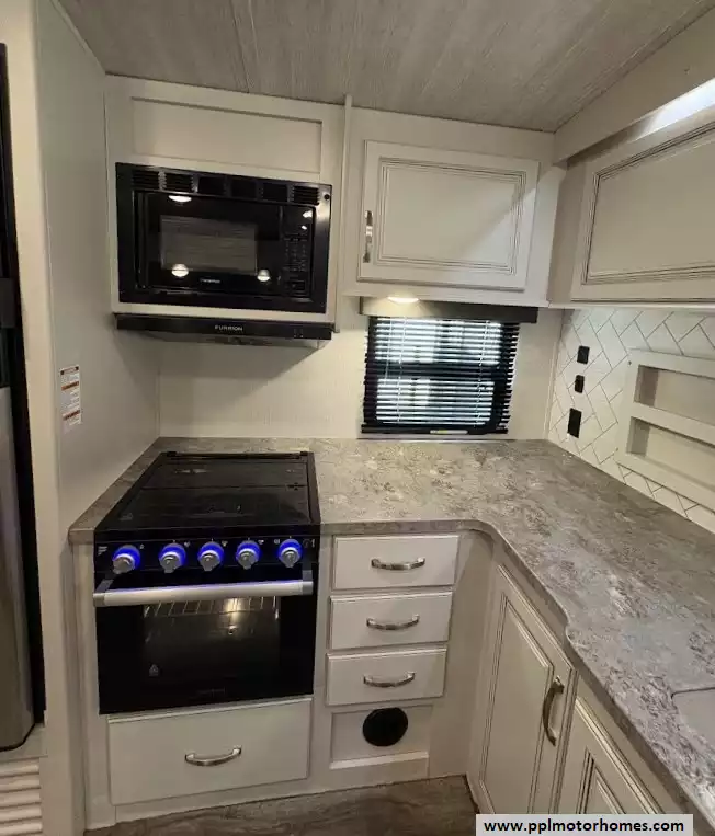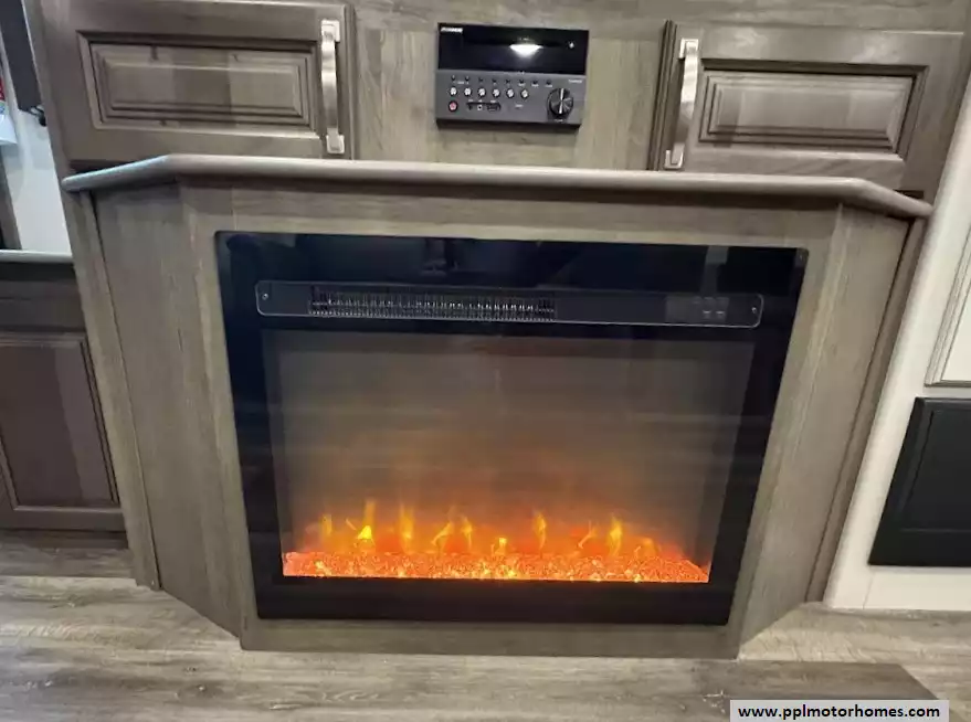 The 30RKD model is specifically renowned for its gourmet rear kitchen layout, which offers an impressive amount of counter space and storage, making it a favorite for those who enjoy cooking and entertaining while on the road. Other features include 2 door refrigerator, 3 burner stove, oven, microwave and undermounted stainless steel sink. The central living room features theater seating, an entertainment center with a large TV, and a fireplace for added ambiance and heating.