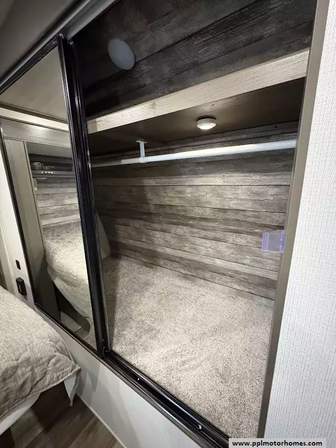 The bedroom in the 2022 Keystone Cougar 30RKD is a private master suite located at the front of the trailer, featuring a slide-out to maximize floor space. The king-sized bed is situated within its own slide-out, providing significant walk-around space on both sides as well as under-bed storage. A massive, full-width wardrobe with sliding mirrored doors spans the entire front nose of the trailer. Located at the foot of the bed, a large built-in dresser provides additional drawer space. Additional cabinets are placed above the headboard for small essentials. The bathroom is a central walk-through design, conveniently situated between the main living area and the front master bedroom. It acts as an en-suite for the bedroom while still allowing access from the main cabin.