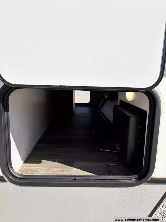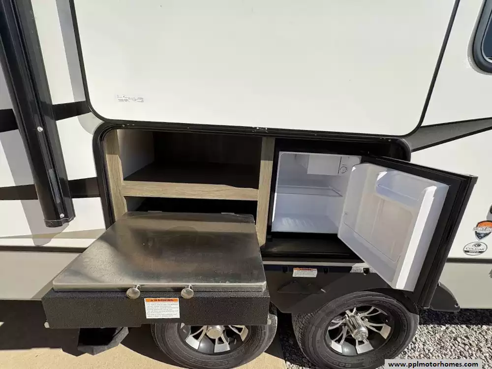 The exterior of the 2022 Keystone Cougar 30RKD is designed for durability and ease of use, featuring an outdoor grill and fridge, power awning, and a fully enclosed underbelly for four-season camping. The RV offers a full pass-through storage compartment with slam-latch baggage doors for convenient access to gear. A hot and cold exterior spray port is useful for rinsing off gear or feet after a day outdoors.