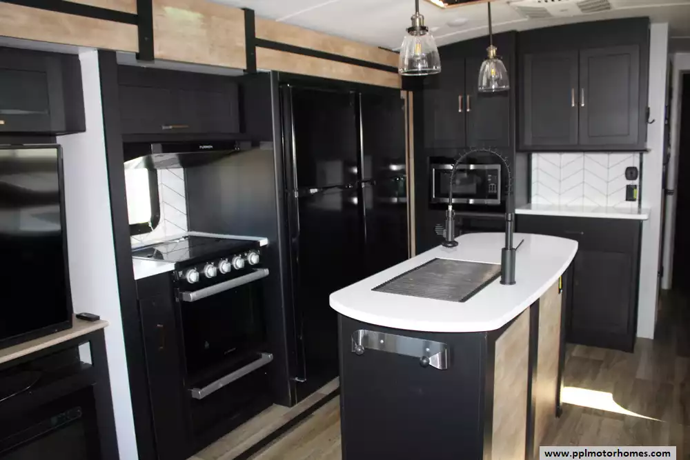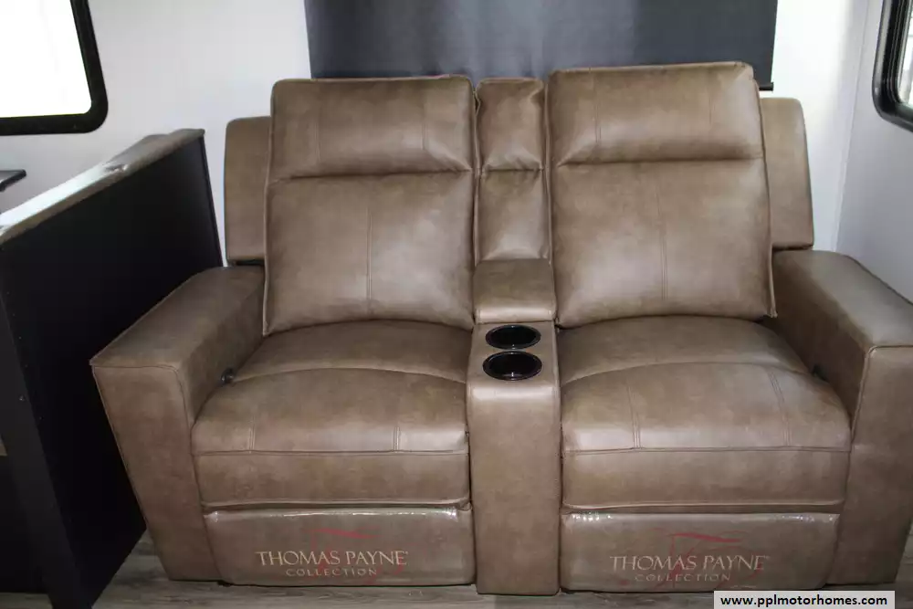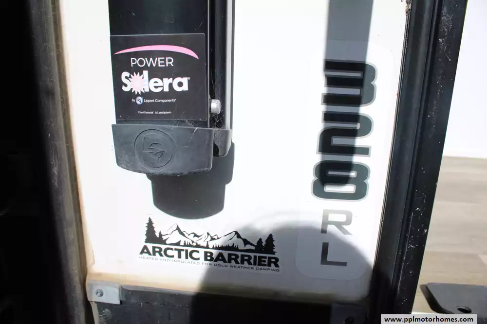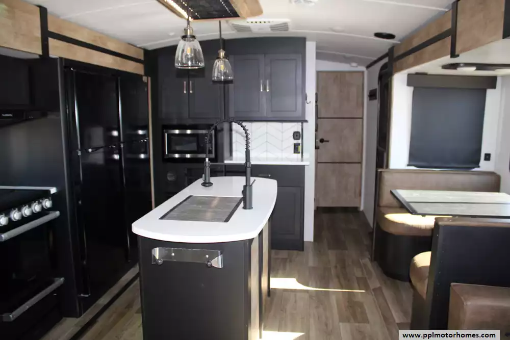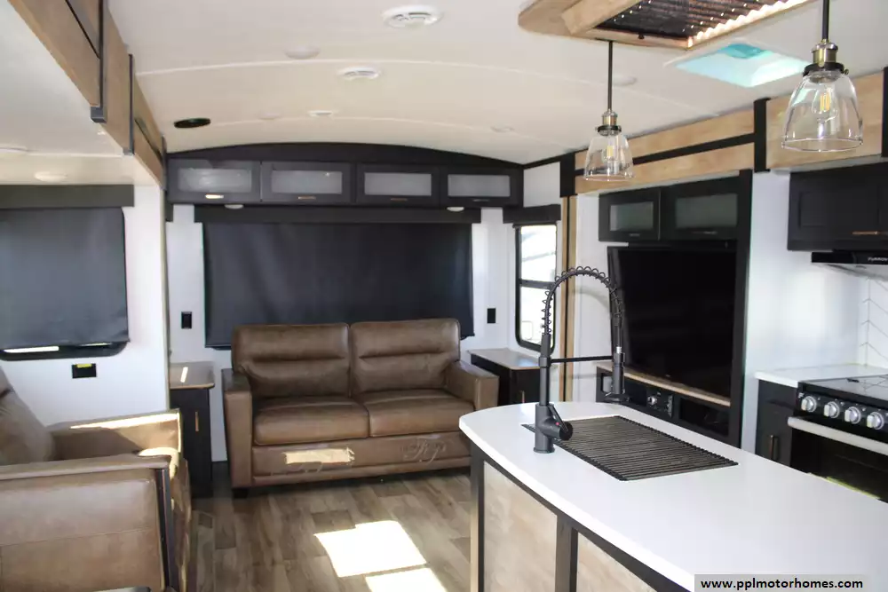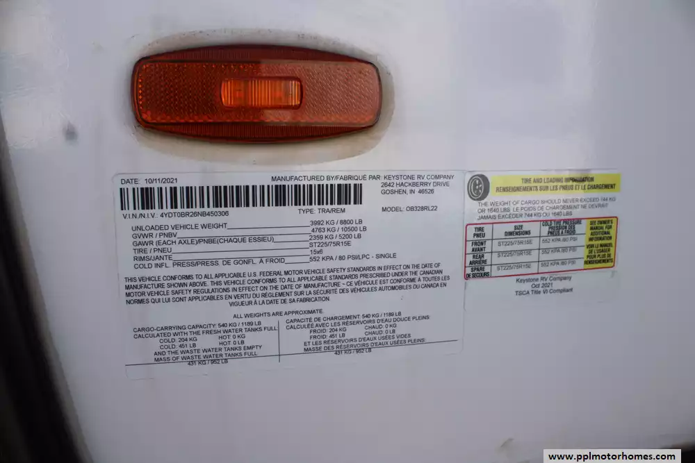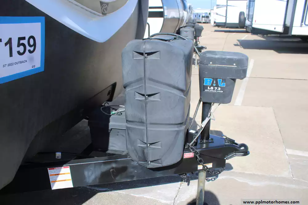 The 2022 Keystone Outback 328RL is a well-appointed mid-sized travel trailer measuring roughly 37 ft 7 in long, weighing in at about 8,702 lb dry with a hitch weight around 1,075 lb, and offering a sleeping capacity for up to six via a front king bedroom and dual sleeper seating in the rear living area. The 328RL features three power slide-outs to maximize interior volume, a center-island kitchen with a 10 cu ft. 12 V GE refrigerator, a booth dinette, theater-style recliners, and a rear entertainment center with 50" HDTV and fireplace. Built on Keystone's BAL Norco "Z" channel frame with MORryde suspension and BAL stabilizer, it includes weather-resistant climate control, lithium battery, on-demand hot water, washer/dryer prep, dual awnings, outdoor speakers, built-in pet kennel storage, and solar panel. With stylish design, residential amenities, and solid structural engineering, the Outback 328RL offers a balanced blend of comfort, versatility, and season-extending functionality.