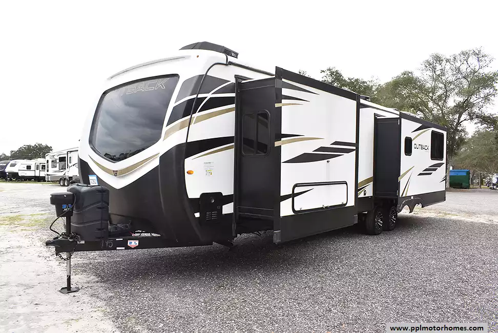 This 2022 Outback by Keystone 330RL has an Electric Tongue Jack, 3 Slide-outs, 2 Ducted Air Conditioners, Double Door 12v Residential Ge Refrigerator, Automatic Main Awning, Washer/Dryer Connections, Solar Panel, Heated Tanks, Outside Speakers, 2 TVs, DVD Player, Outdoor Grill, Outdoor Kitchen, Fireplace, Microwave, 3 Burner Range, Oven