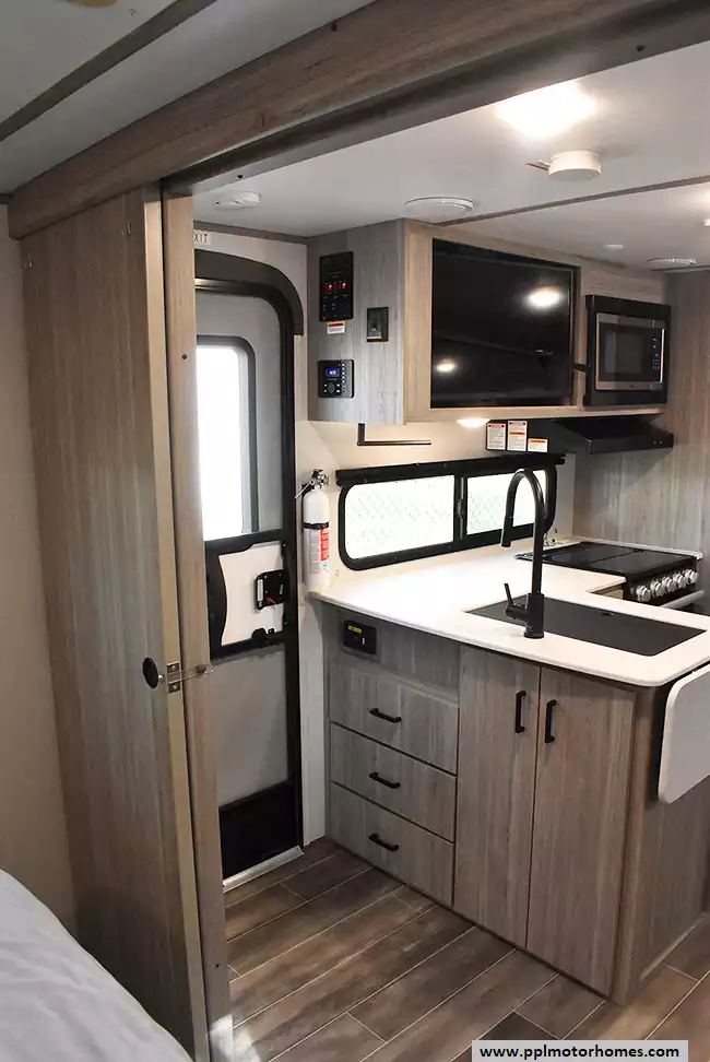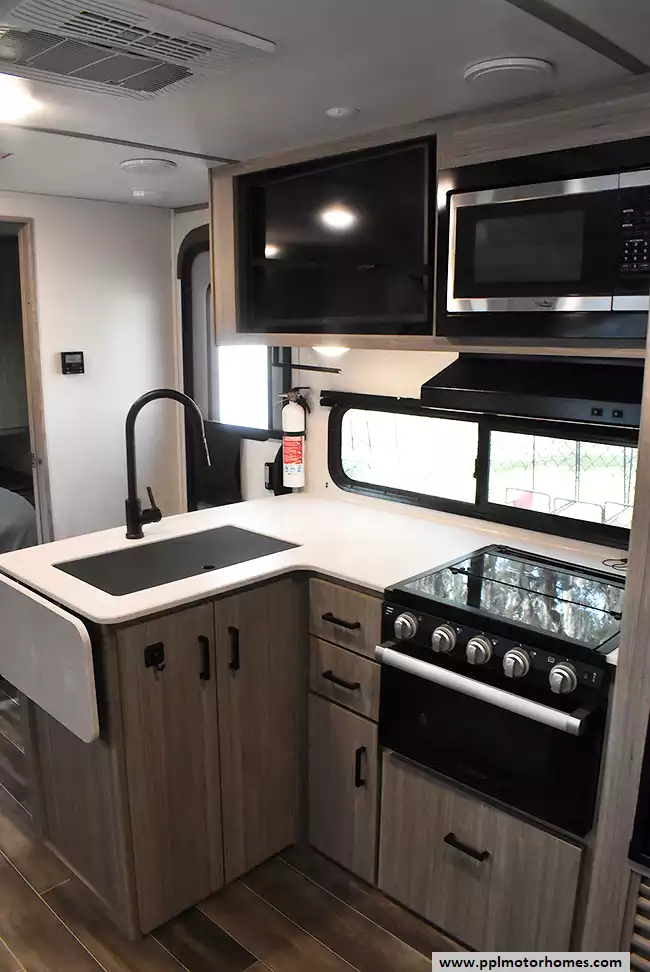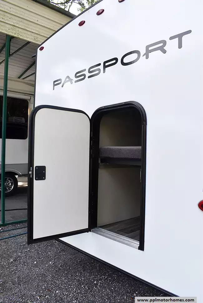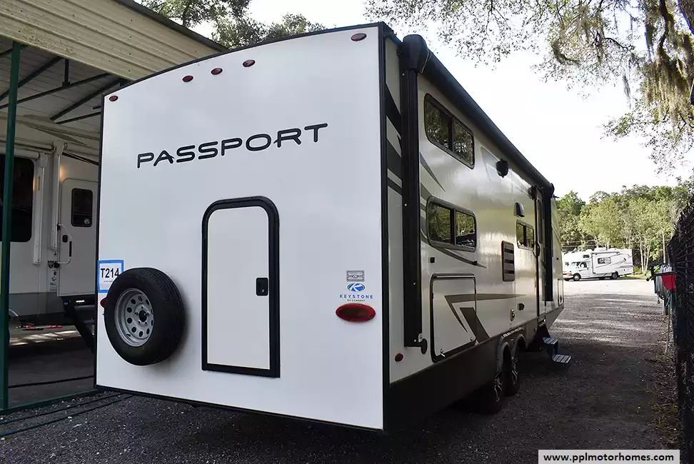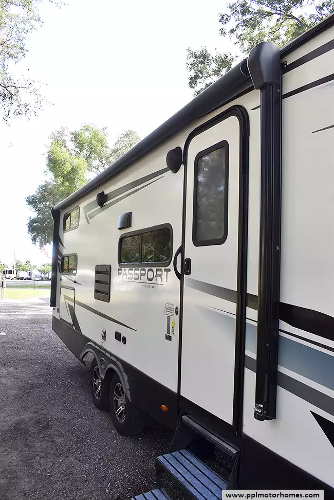 This 2022 Passport 268BH has an Electric Tongue Jack, 1 Slide-out, Double Door Gas/110v Norcold Refrigerator, Automatic Main Awning, Solar Panel, Satellite Receiver, Outside Speakers, TV, Outdoor Grill, Outdoor Kitchen, Microwave, 3 Burner Range, Oven